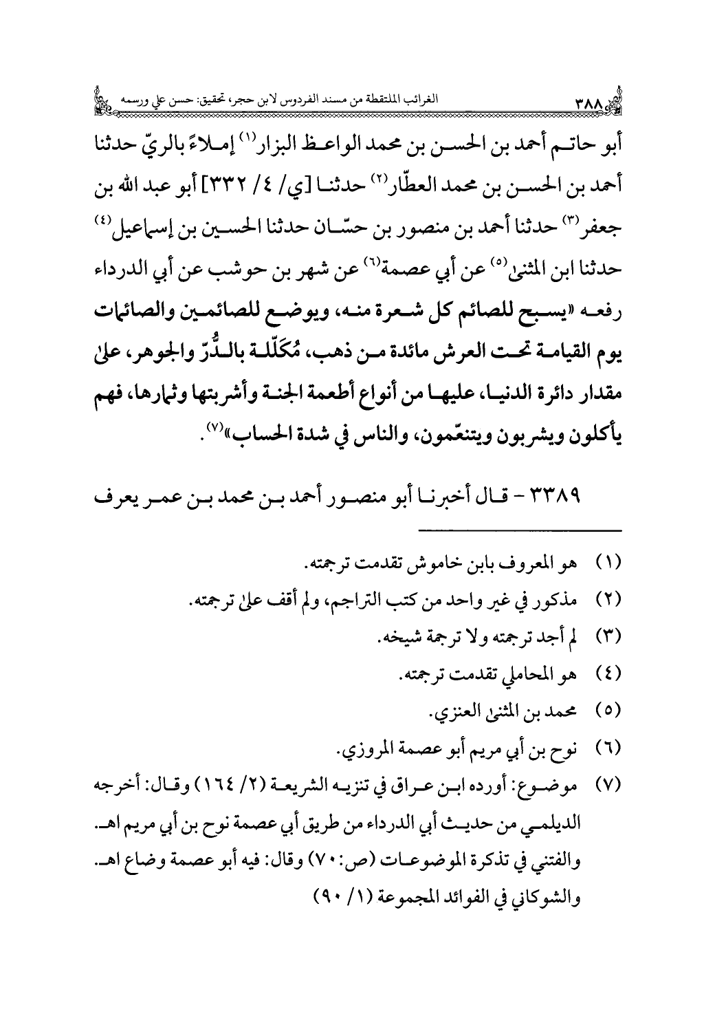 أبو حاتم أحمد بن الحسن بن محمد الواعظ البزار (¬١) إملاءً بالريّ حدثنا أحمد بن الحسن بن محمد العطّار (¬٢) حدثنا أبو عبد اللَّه بن جعفر (¬٣) حدثنا أحمد بن منصور بن حسّان حدثنا الحسين بن إسماعيل (¬٤) حدثنا ابن المثنى (¬٥) عن أبي عصمة (¬٦) عن شهر بن حوشب عن أبي الدرداء رفعه "يسبح للصائم كل شعرة منه، ويوضع للصائمين والصائمات يوم القيامة تحت العرش مائدة من ذهب، مُكَلّلة بالدُّرّ والجوهر، على مقدار دائرة الدنيا، عليها من أنواع أطعمة الجنة وأشربتها وثمارها، فهم يأكلون ويشربون ويتنعّمون، والناس في شدة الحساب" (¬٧).