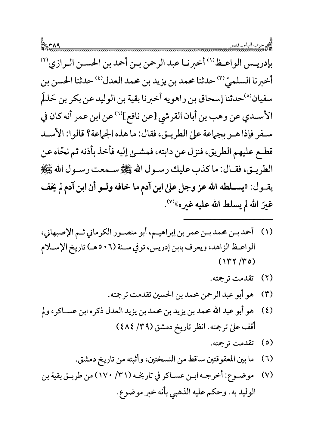 بإدريس الواعظ (¬١) أخبرنا عبد الرحمن بن أحمد بن الحسن الرازي (¬٢) أخبرنا السلميّ (¬٣) حدثنا محمد بن يزيد بن محمد العدل (¬٤) حدثنا الحسن بن سفيان (¬٥) حدثنا إسحاق بن راهويه أخبرنا بقية بن الوليد عن بكر بن حَذلَم الأسدي عن وهب بن أبان القرشي [عن نافع] (¬٦) عن ابن عمر أنه كان في سفر فإذا هو بجماعة على الطريق، فقال: ما هذه الجماعة؟ قالوا: الأسد قطع عليهم الطريق، فنزل عن دابته، فمشى إليه فأخذ بأذنه ثم نحّاه عن الطريق، فقال: ما كذب عليك رسول اللَّه -صلى اللَّه عليه وسلم- سمعت رسول اللَّه -صلى اللَّه عليه وسلم- يقول: "يسلطه اللَّه عز وجل على ابن آدم ما خافه ولو أن ابن آدم لم يخف غيرَ اللَّه لم يسلط اللَّه عليه غيره" (¬٧).