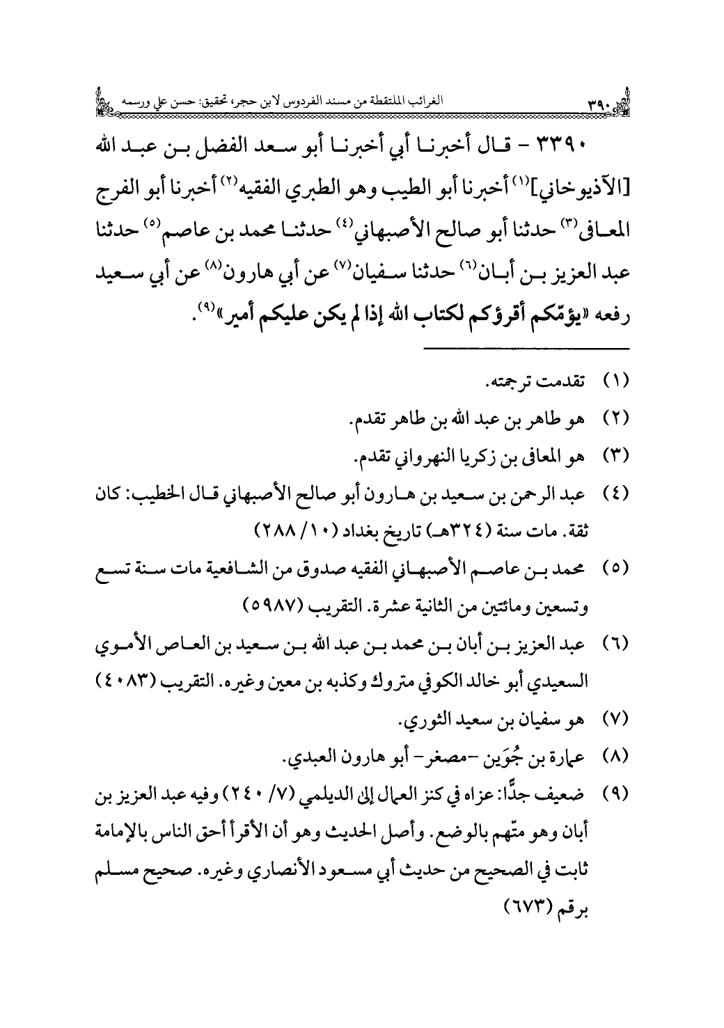 ٣٣٩٠ - قال أخبرنا أبي أخبرنا أبو سعد الفضل بن عبد اللَّه [الآذيوخاني] (¬١) أخبرنا أبو الطيب وهو الطبري الفقيه (¬٢) أخبرنا أبو الفرج المعافى (¬٣) حدثنا أبو صالح الأصبهاني (¬٤) حدثنا محمد بن عاصم (¬٥) حدثنا عبد العزيز بن أبان (¬٦) حدثنا سفيان (¬٧) عن أبي هارون (¬٨) عن أبي سعيد رفعه "يؤمّكم أقرؤكم لكثاب اللَّه إذا لم يكن عليكم أمير" (¬٩).