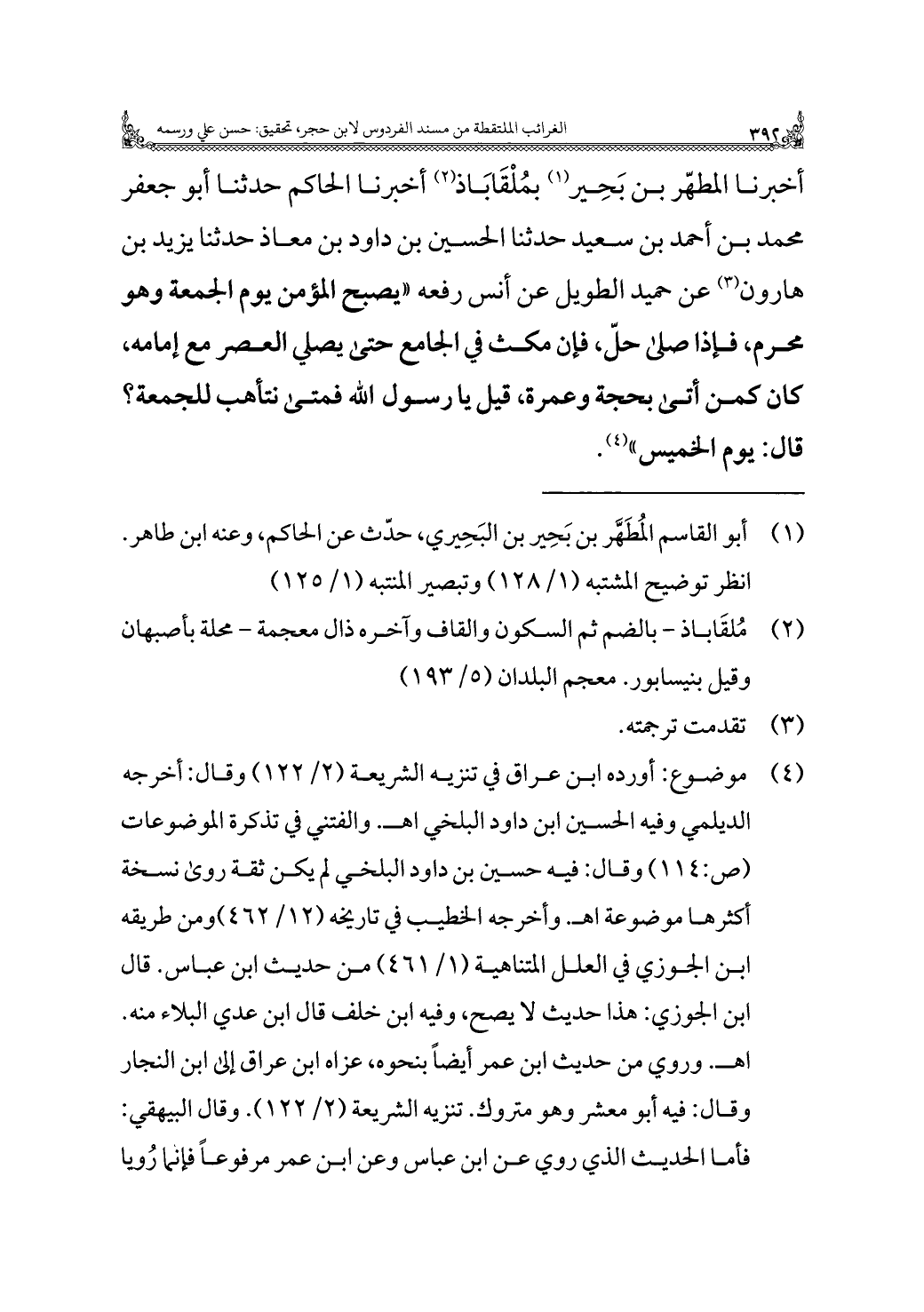 أخبرنا المطهّر بن بَحِير (¬١) بمُلْقَابَاذ (¬٢) أخبرنا الحاكم حدثنا أبو جعفر محمد بن أحمد بن سعيد حدثنا الحسين بن داود بن معاذ حدثنا يزيد بن هارون (¬٣) عن حميد الطويل عن أنس رفعه "يصبح المؤمن يوم الجمعة وهو محرم، فإذا صلى حلّ، فإن مكث في الجامع حتى يصلي العصر مع إمامه، كان كمن أتى بحجة وعمرة، قيل يا رسول اللَّه فمتى نتأهب للجمعة؟ قال: يوم الخميس" (¬٤).