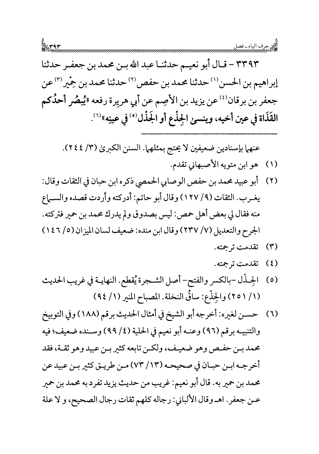 ٣٣٩٣ - قال أبو نعيم حدثنا عبد اللَّه بن محمد بن جعفر حدثنا إبراهيم بن الحسن (¬١) حدثنا محمد بن حفص (¬٢) حدثنا محمد بن حِمْير (¬٣) عن جعفر بن برقان (¬٤) عن يزيد بن الأصِم عن أبي هريِرة رفعه "يُبصُر أحدُكم القَذَاة في عين أخيه، وينسى الجِذْع أو الجَذْل (¬٥) في عينِه" (¬٦).
