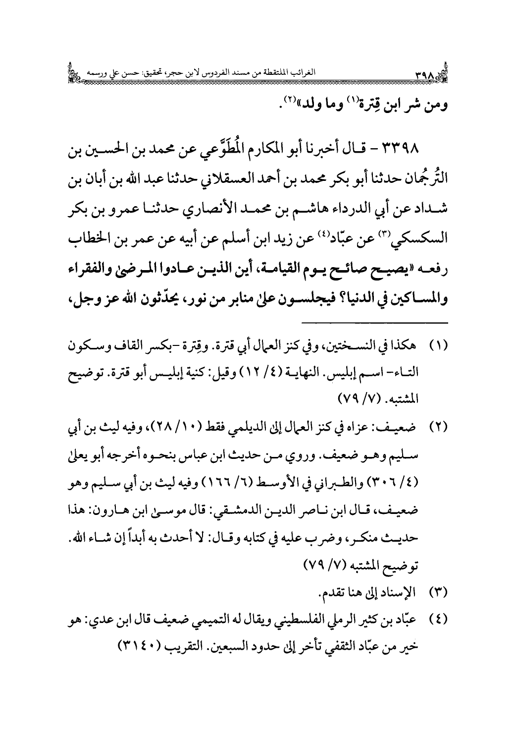 ٣٣٩٨ - قال أخبرنا أبو المكارم المُطَوَّعي عن محمد بن الحسين بن التُرجُمان حدثنا أبو بكر محمد بن أحمد العسقلاني حدثنا عبد اللَّه بن أبان بن شداد عن أبي الدرداء هاشم بن محمد الأنصاري حدثنا عمرو بن بكر السكسكي (¬٣) عن عبّاد (¬٤) عن زيد ابن أسلم عن أبيه عن عمر بن الخطاب رفعه "يصيح صائح يوم القيامة، أين الذين عادوا المرضى والفقراء والمساكين في الدنيا؟ فيجلسون على منابر من نور، يحدّثون اللَّه عز وجل،