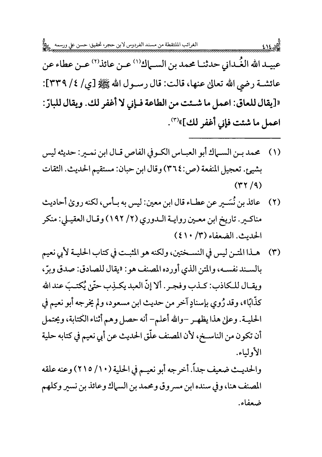 (¬١) محمد بن السماك أبو العباس الكوفي الفاص قال ابن نمير: حديثه ليس بشيئ. تعجيل المنفعة (ص: ٣٦٤) وقال ابن حبان: مستقيم الحديث. الثقات (٩/ ٣٢).