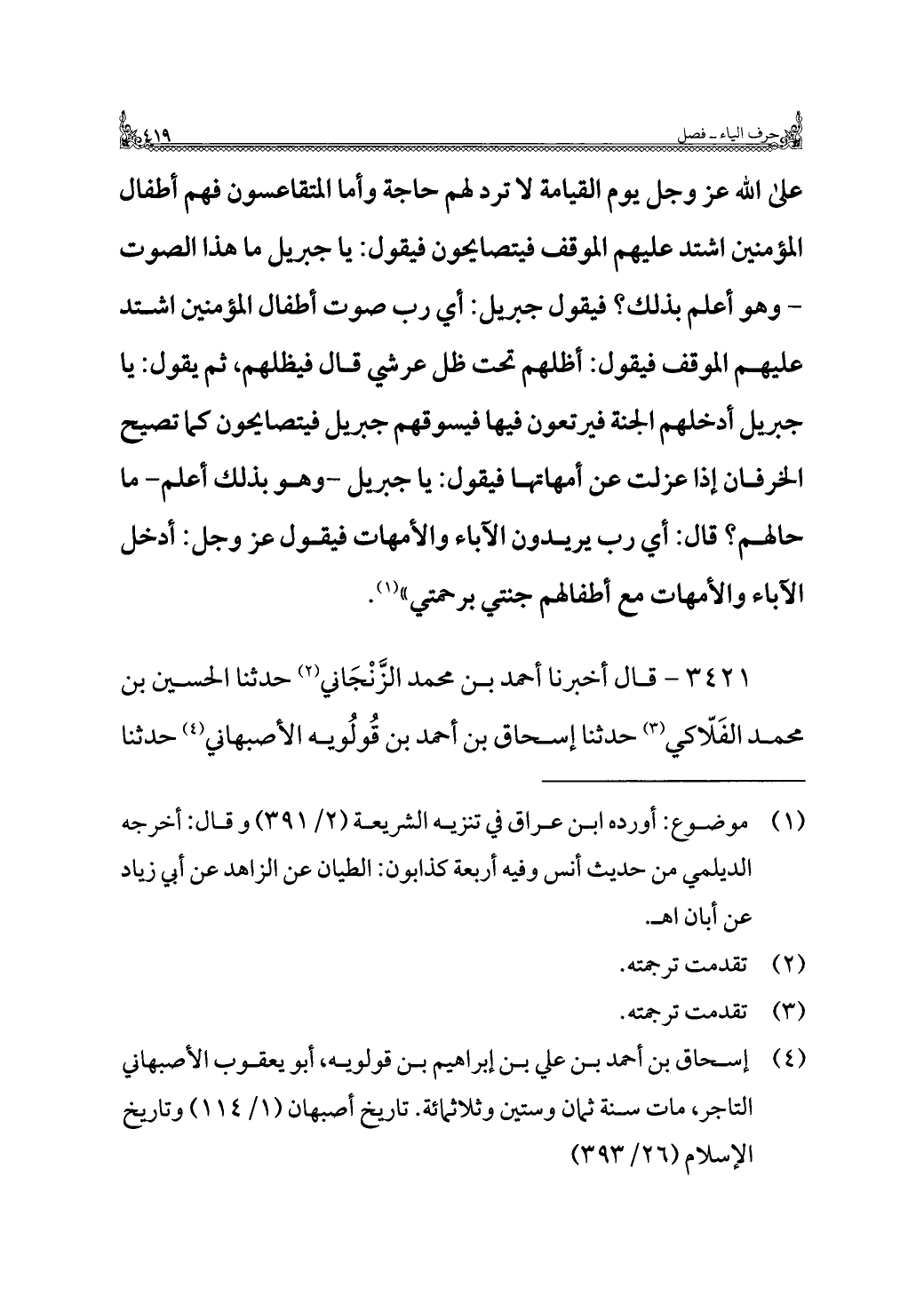 ٣٤٢١ - قال أخبرنا أحمد بن محمد الزَّنْجَاني (¬٢) حدثنا الحسين بن محمد الفَلّاكي (¬٣) حدثنا إسحاق بن أحمد بن قُولُويه الأصبهاني (¬٤) حدثنا