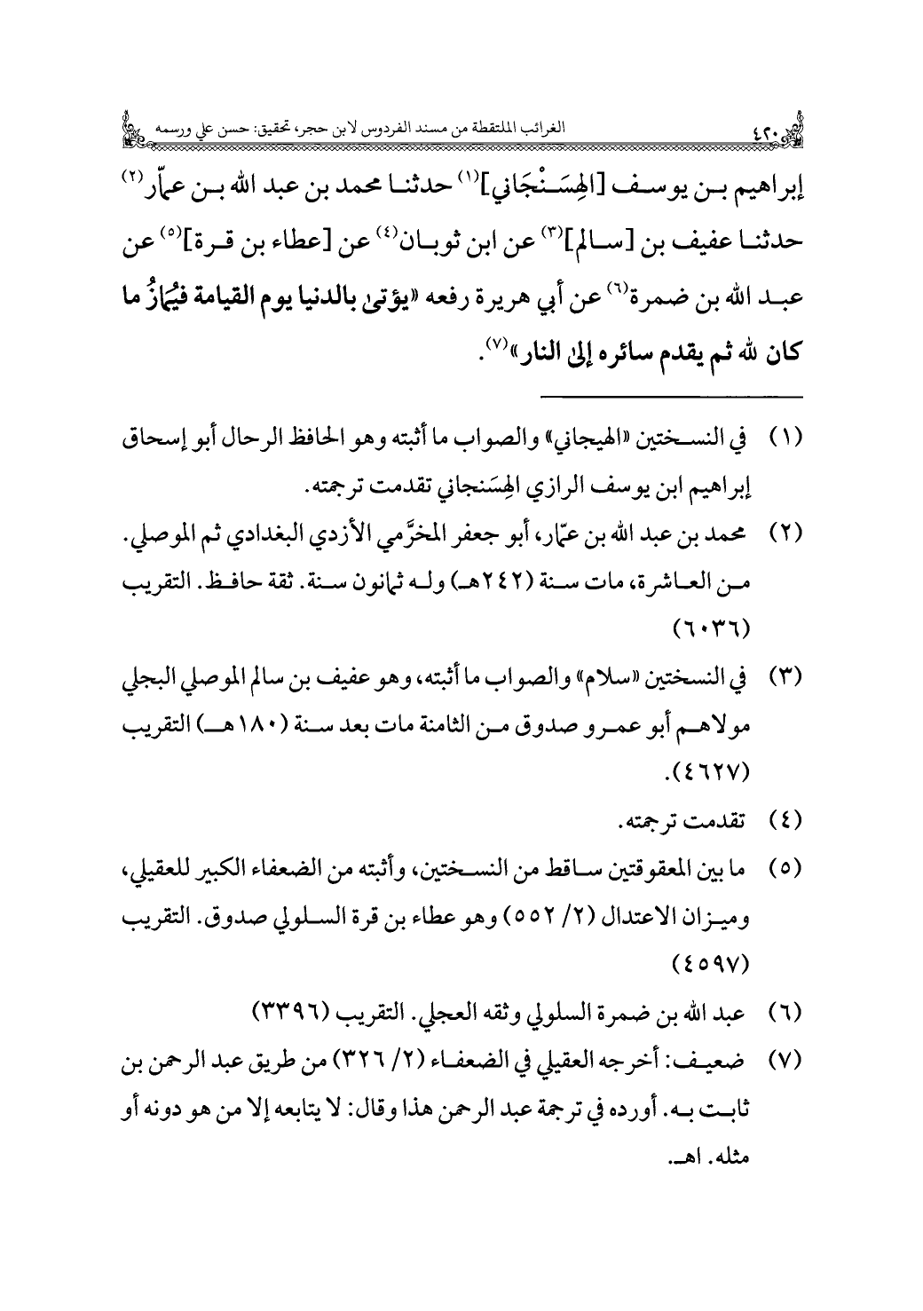 إبراهيم بن يوسف [الهِسَنْجَاني] (¬١) (حدثنا محمد بن عبد اللَّه بن عمّار (¬٢) حدثنا عفيف بن [سالم] (¬٣) عن ابن ثوبان (¬٤) عن [عطاء بن قرة] (¬٥) عن عبد اللَّه بن ضمرة (¬٦) عن أبي هريرة رفعه "يؤتى بالدنيا يوم القيامه فيُمَازُ ما كان للَّه ثم يقدم سائره إلى النار" (¬٧).