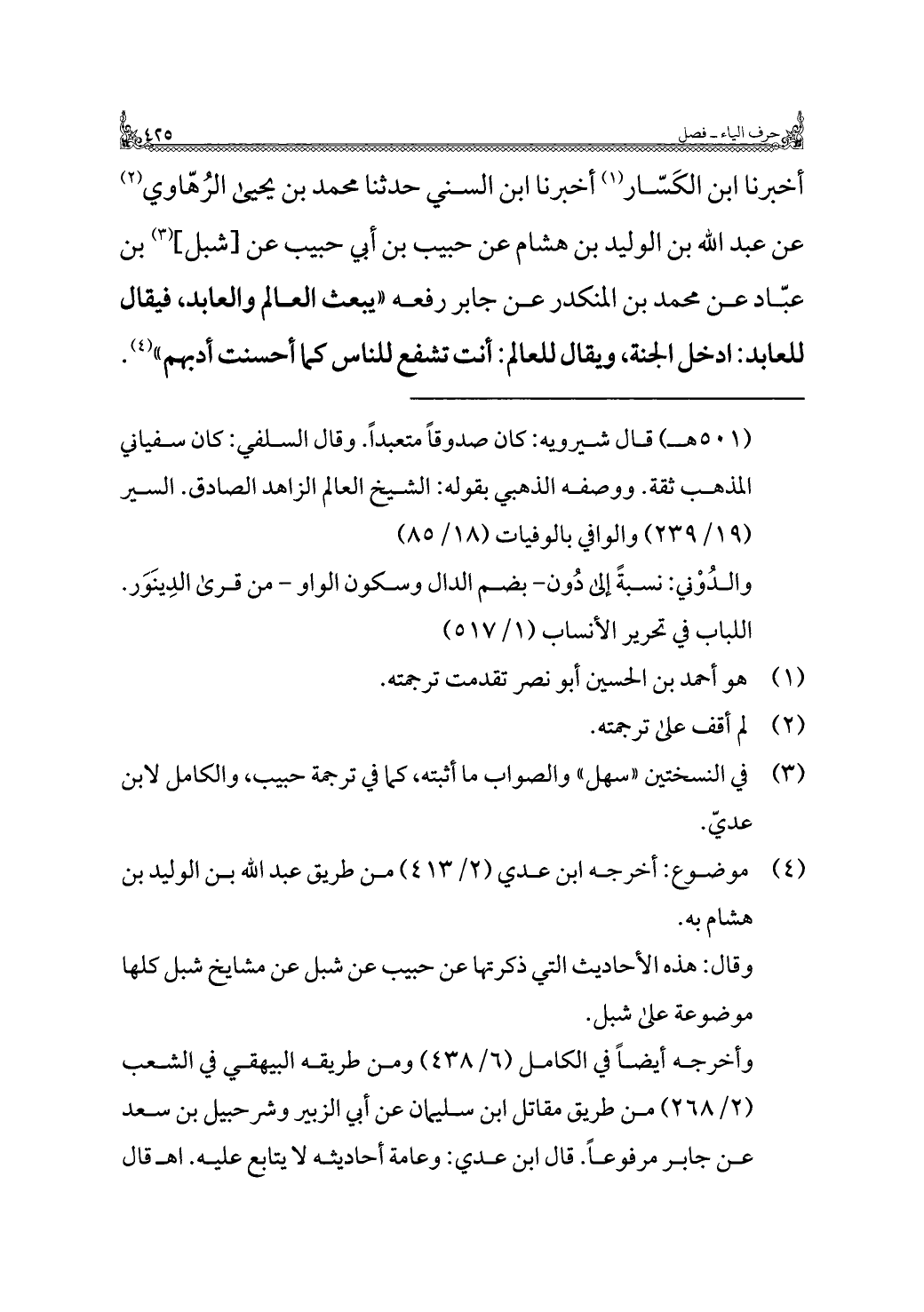 أخبرنا ابن الكَسّار (¬١) أخبرنا ابن السني حدثنا محمد بن يحيى الرُهّاوي (¬٢) عن عبد اللَّه بن الوليد بن هشام عن حبيب بن أبي حبيب عن [شبل] (¬٣) بن عبّاد عن محمد بن المنكدر عن جابر رفعه "يبعث العالم والعابد، فيقال للعابد: ادخل الجنة، ويقال للعالم: أنت تشفع للناس كما أحسنت أدبهم" (¬٤).