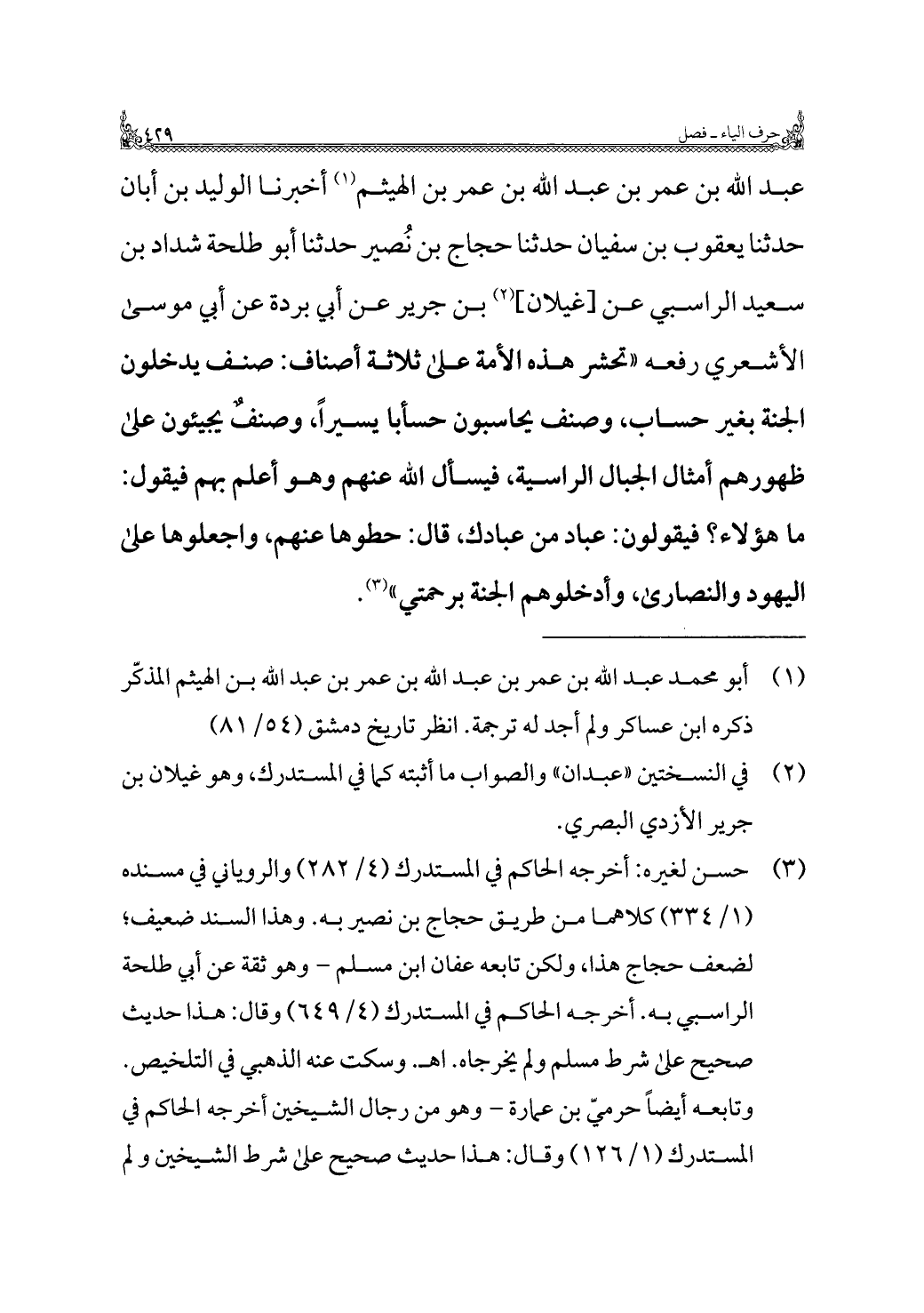 عبد اللَّه بن عمر بن عبد اللَّه بن عمر بن الهيثم (¬١) أخبرنا الوليد بن أبان حدثنا يعقوب بن سفيان حدثنا حجاج بن نُصير حدثنا أبو طلحة شداد بن سعيد الراسبي عن [غيلان] (¬٢) بن جرير عن أبي بردة عن أبي موسى الأشعري رفعه "تحشر هذه الأمة على ثلاثة أصناف: صنف يدخلون الجنة بغير حساب، وصنف يحاسبون حسابًا يسيرًا، وصنفًا يجيئون على ظهورهم أمثال الجبال الراسية، فيسأل اللَّه عنهم وهو أعلم بهم فيقول: ما هؤلاء؟ فيقولون: عباد من عبادك، قال: حطوها عنهم، واجعلوها على اليهود والنصارى، وأدخلوهم الجنة برحمتي" (¬٣).