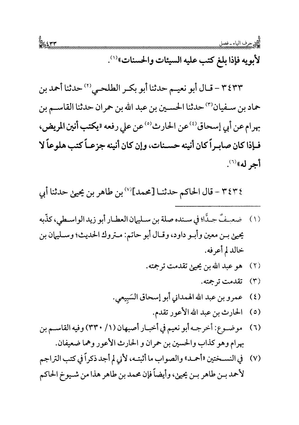 ٣٤٣٣ - قال أبو نعيم حدثنا أبو بكر الطلحي (¬٢) حدثنا أحمد بن حماد بن سفيان (¬٣) حدثنا الحسين بن عبد اللَّه بن حمران حدثنا القاسم بن بهرام عن أبي إسحاق (¬٤) عن الحارث (¬٥) عن علي رفعه "يكتب أنين المريض، فإذا كان صابرًا كان أنينه حسنات، وإن كان أنينه جزعًا كتب هلوعًا لا أجر له" (¬٦).
