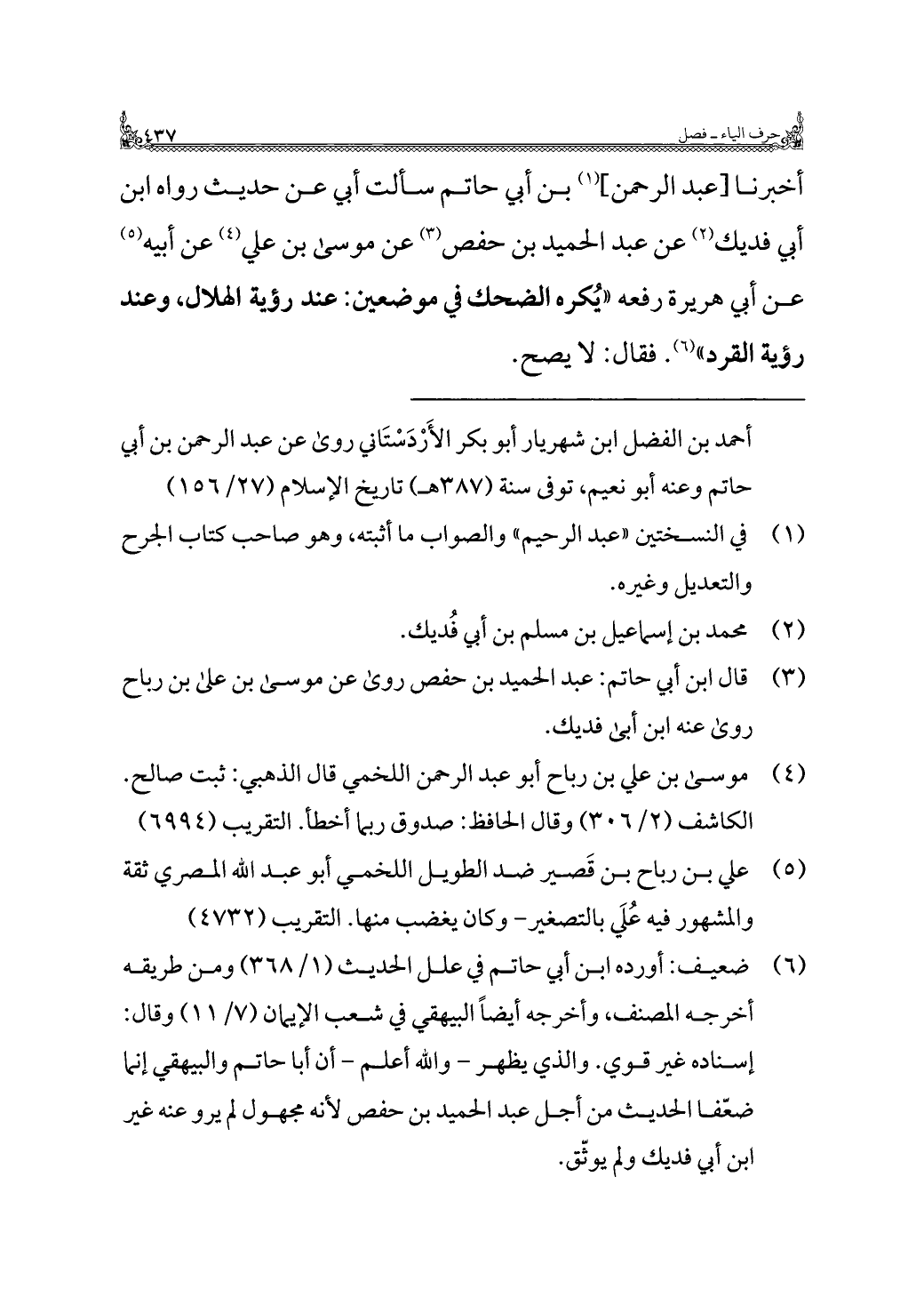 أخبرنا [عبد الرحمن] (¬١) بن أبي حاتم سألت أبي عن حديث رواه ابن أبي فديك (¬٢) عن عبد الحميد بن حفص (¬٣) عن موسى بن علي (¬٤) عن أبيه (¬٥) عن أبي هريرة رفعه "يُكره الضحك في موضعين: عند رؤية الهلال، وعند رؤية القرد" (¬٦). فقال: لا يصح.