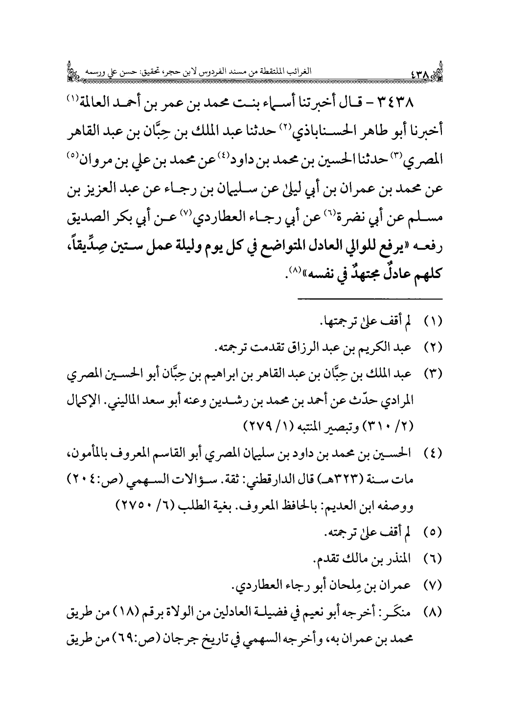 ٣٤٣٨ - قال أخبرتنا أسماء بنت محمد بن عمر بن أحمد العالمة (¬١) أخبرنا أبو طاهر الحسناباذي (¬٢) حدثنا عبد الملك بن حِبَّان بن عبد القاهر المصري (¬٣) حدثنا الحسين بن محمد بن داود (¬٤) عن محمد بن علي بن مروان (¬٥) عن محمد بن عمران بن أبي ليلى عن سليمان بن رجاء عن عبد العزيز بن مسلم عن أبي نضرة (¬٦) عن أبي رجاء العطاردي (¬٧) عن أبي بكر الصديق رفعه "يرفع للوالي العادل المتواضع في كل يوم وليلة عمل ستين صدِّيقًا، كلهم عادلٌ مجتهدٌ في نفسه" (¬٨).