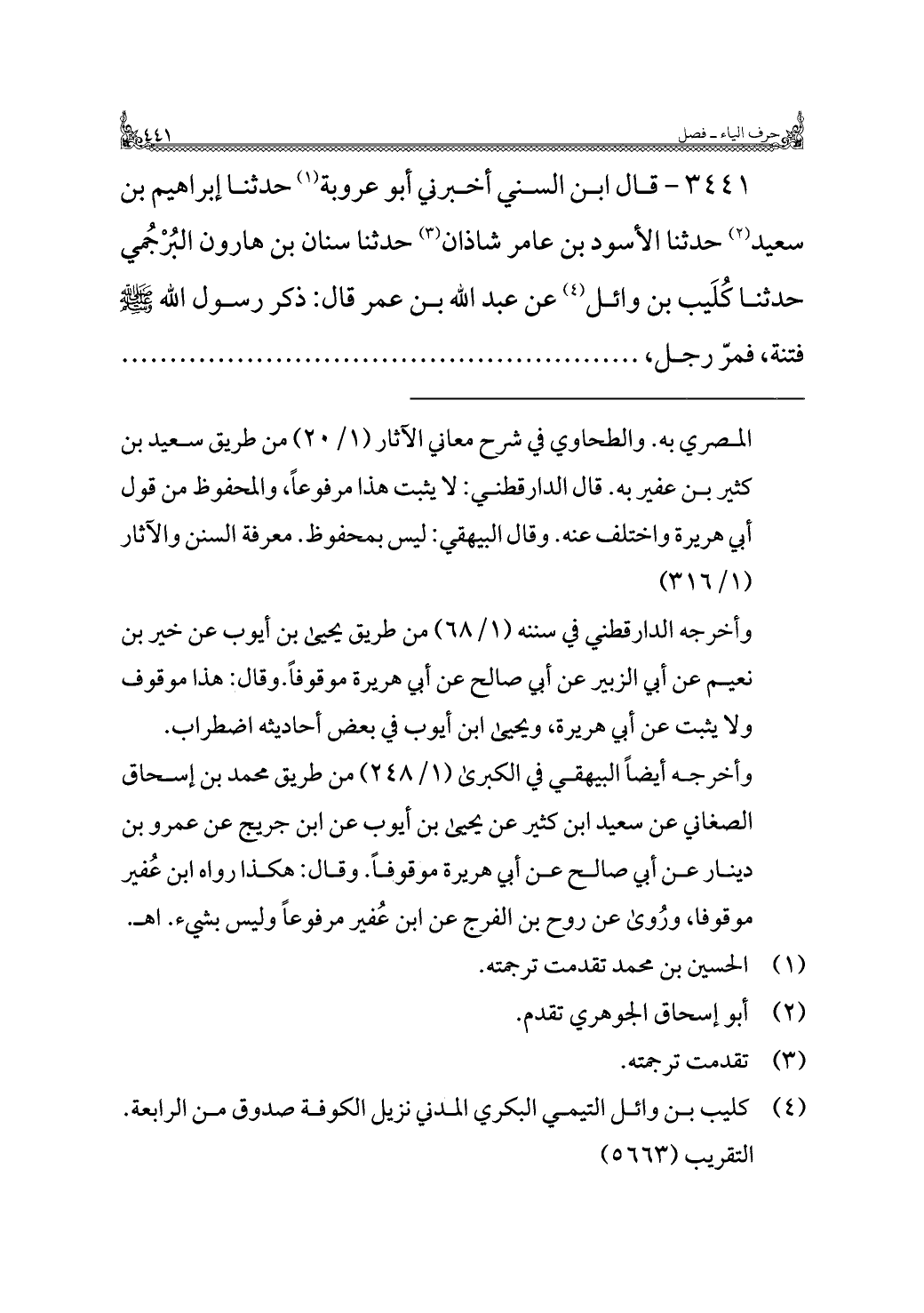 ٣٤٤١ - قال ابن السني أخبرني أبو عروبة (¬١) حدثنا إبراهيم بن سعيد (¬٢) حدثنا الأسود بن عامر شاذان (¬٣) حدثنا سنان بن هارون البُرْجُمي حدثنا كُلَيب بن وائل (¬٤) عن عبد اللَّه بن عمر قال: ذكر رسول اللَّه -صلى اللَّه عليه وسلم- فتنة، فمرّ رجل، . . . . .