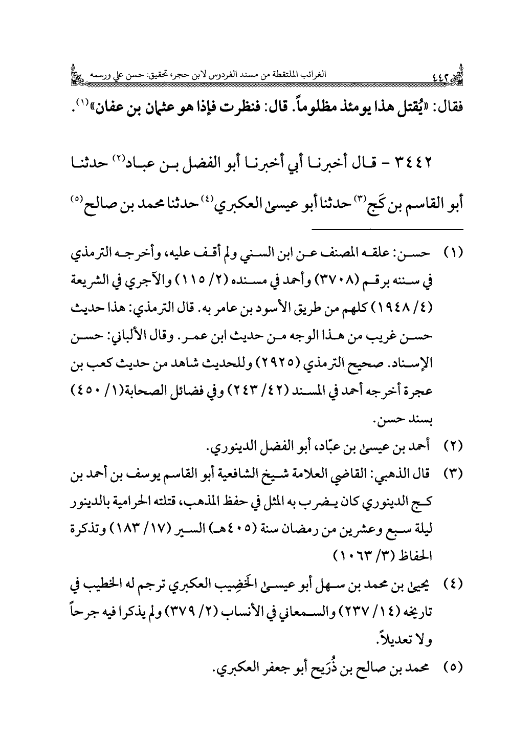 ٣٤٤٢ - قال أخبرنا أبي أخبرنا أبو الفضل بن عباد (¬٢) حدثنا أبو القاسم بن كَج (¬٣) حدثنا أبو عيسى العكبري (¬٤) حدثنا محمد بن صالح (¬٥)