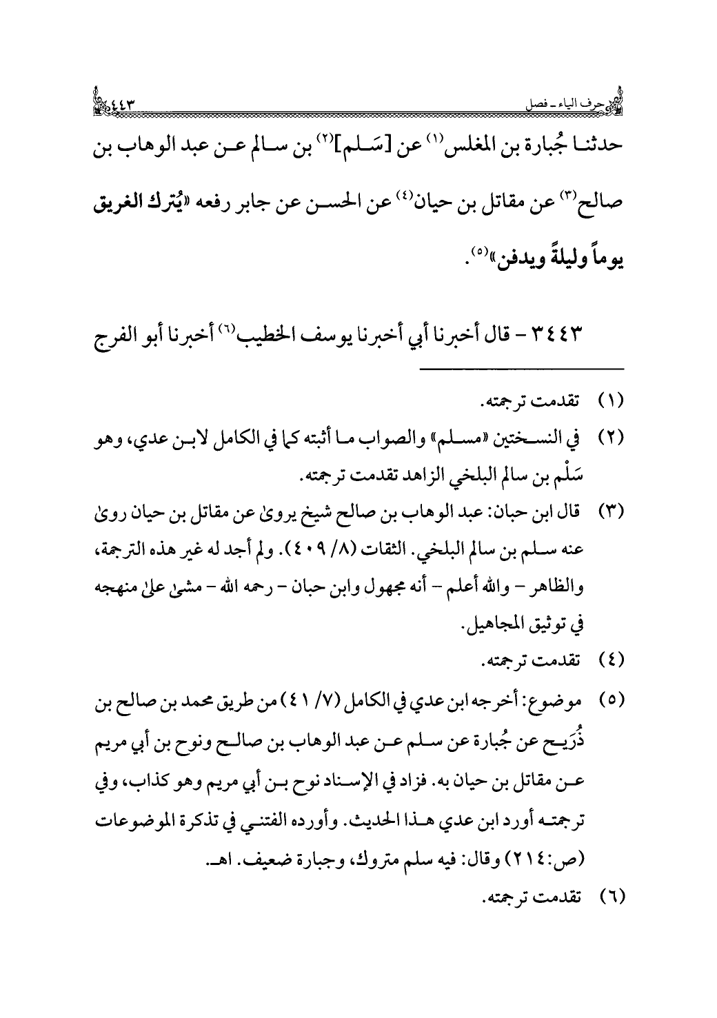 حدثنا جُبارة بن المغلس (¬١) عن [سَلم] (¬٢) بن سالم عن عبد الوهاب بن صالح (¬٣) عن مقاتل بن حيان (¬٤) عن الحسن عن جابر رفعه "يُترك الغريق يومًا وليلةً ويدفن" (¬٥).