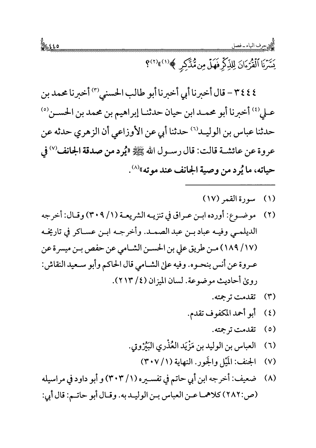 ٣٤٤٤ - قال أخبرنا أبي أخبرنا أبو طالب الحسني (¬٣) أخبرنا محمد بن علي (¬٤) أخبرنا أبو محمد ابن حيان حدثنا إبراهيم بن محمد بن الحسن (¬٥) حدثنا عباس بن الوليد (¬٦) حدثنا أبي عن الأوزاعي أن الزهري حدثه عن عروة عن عائشة قالت: قال رسول اللَّه -صلى اللَّه عليه وسلم- "يُرد من صدقة الجانف (¬٧) في حياته، ما يُرد من وصية الجانف عند موته" (¬٨).
