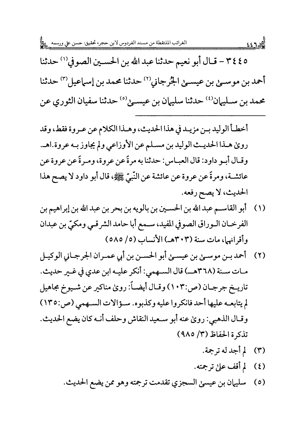 ٣٤٤٥ - قال أبو نعيم حدثنا عبد اللَّه بن الحسين الصوفي (¬١) حدثنا أحمد بن موسى بن عيسى الجُرجاني (¬٢) حدثنا محمد بن إسماعيل (¬٣) حدثنا محمد بن سليمان (¬٤) حدثنا سليمان بن عيسى (¬٥) حدثنا سفيان الثوري عن