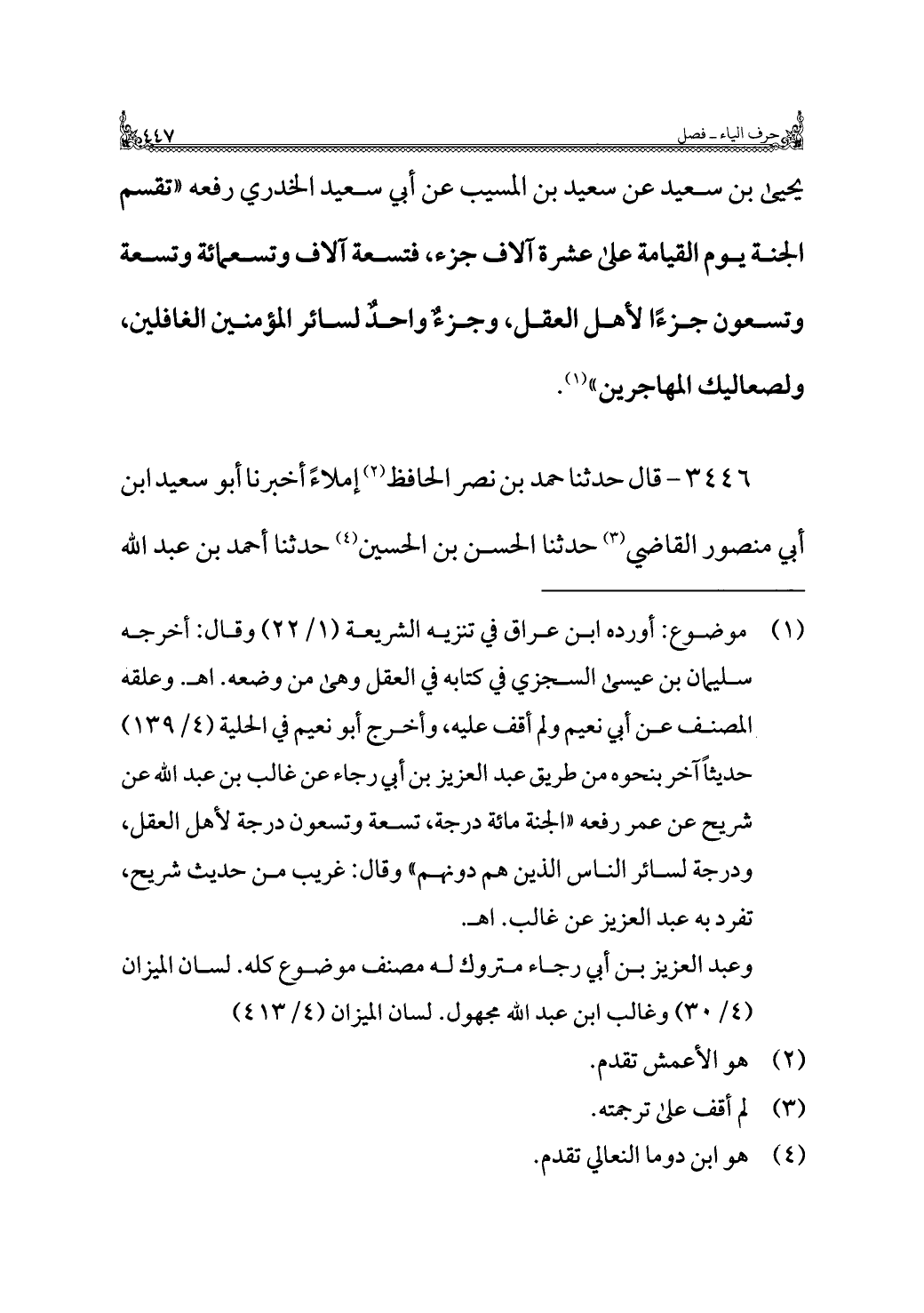 يحيى بن سعيد عن سعيد بن المسيب عن أبي سعيد الخدري رفعه "تقسم الجنة يوم القيامة على عشرة آلاف جزء، فتسعة آلاف وتسعمائة وتسعة وتسعون جزءًا لأهل العقل، وجزءٌ واحدٌ لسائر المؤمنين الغافلين، ولصعاليك المهاجرين" (¬١).