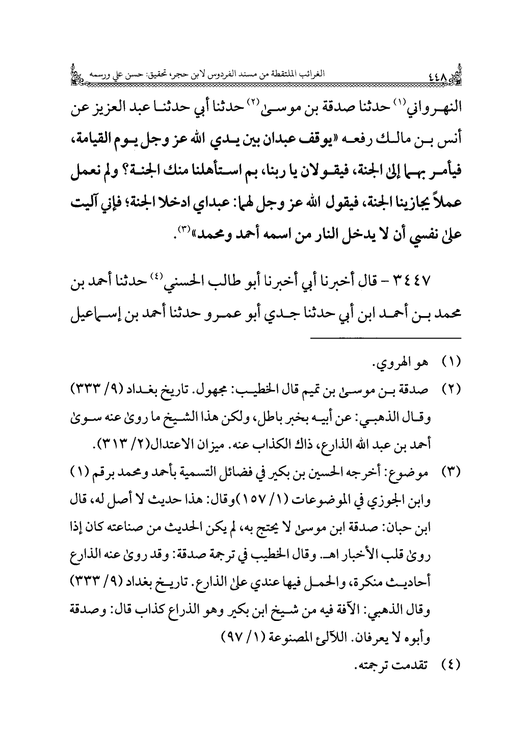 (¬٢) صدقة بن موسى بن تميم قال الخطيب: مجهول. تاريخ بغداد (٩/ ٣٣٣) وقال الذهبي: عن أبيه بخبر باطل، ولكن هذا الشيخ ما روى عنه سوى أحمد بن عبد اللَّه الذارع، ذاك الكذاب عنه. ميزان الاعتدال (٢/ ٣١٣).