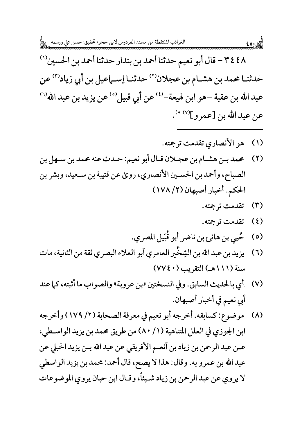 ٣٤٤٨ - قال أبو نعيم حدثنا أحمد بن بندار حدثنا أحمد بن الحسين (¬١) حدثنا محمد بن هشام بن عجلان (¬٢) حدثنا إسماعيل بن أبي زياد (¬٣) عن عبد اللَّه بن عقبة -هو ابن لهيعة- (¬٤) عن أبي قبيل (¬٥) عن يزيد بن عبد اللَّه (¬٦) عن عبد اللَّه بن [عمرو] (¬٧) (¬٨).