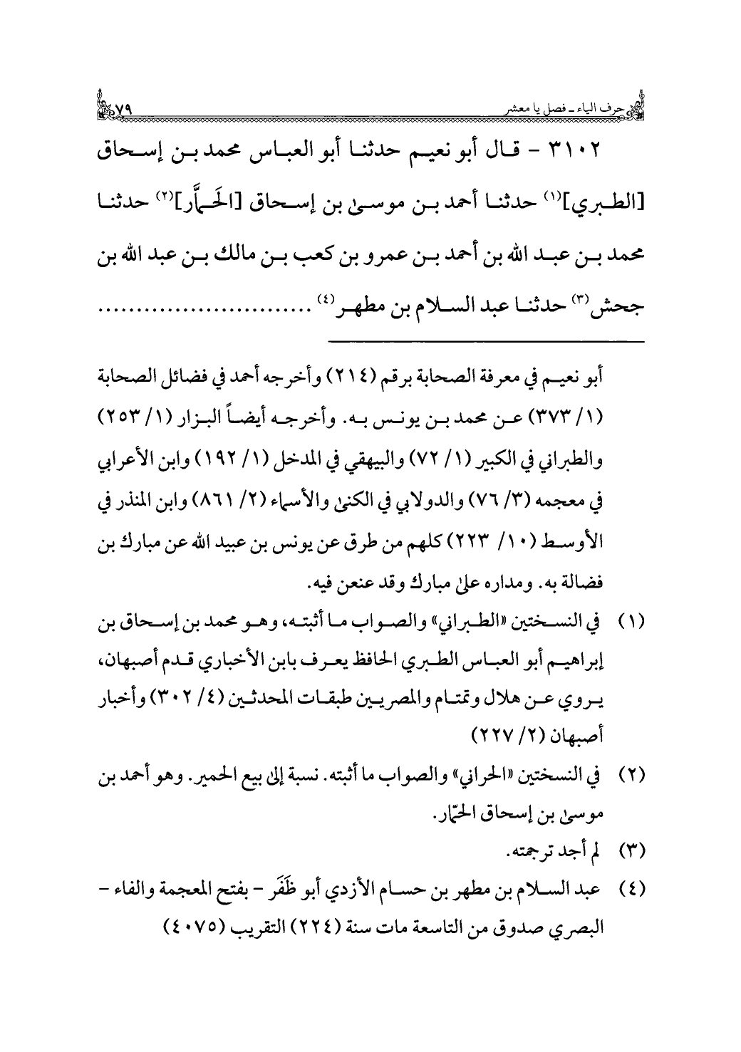 ٣١٠٢ - قال أبو نعيم حدثنا أبو العباس محمد بن إسحاق [الطبري] (¬١) حدثنا أحمد بن موسى بن إسحاق [الحَمَّار] (¬٢) حدثنا محمد بن عبد الله بن أحمد بن عمرو بن كعب بن مالك بن عبد الله بن جحش (¬٣) حدثنا عبد السلام بن مطهر (¬٤). . . . . . .