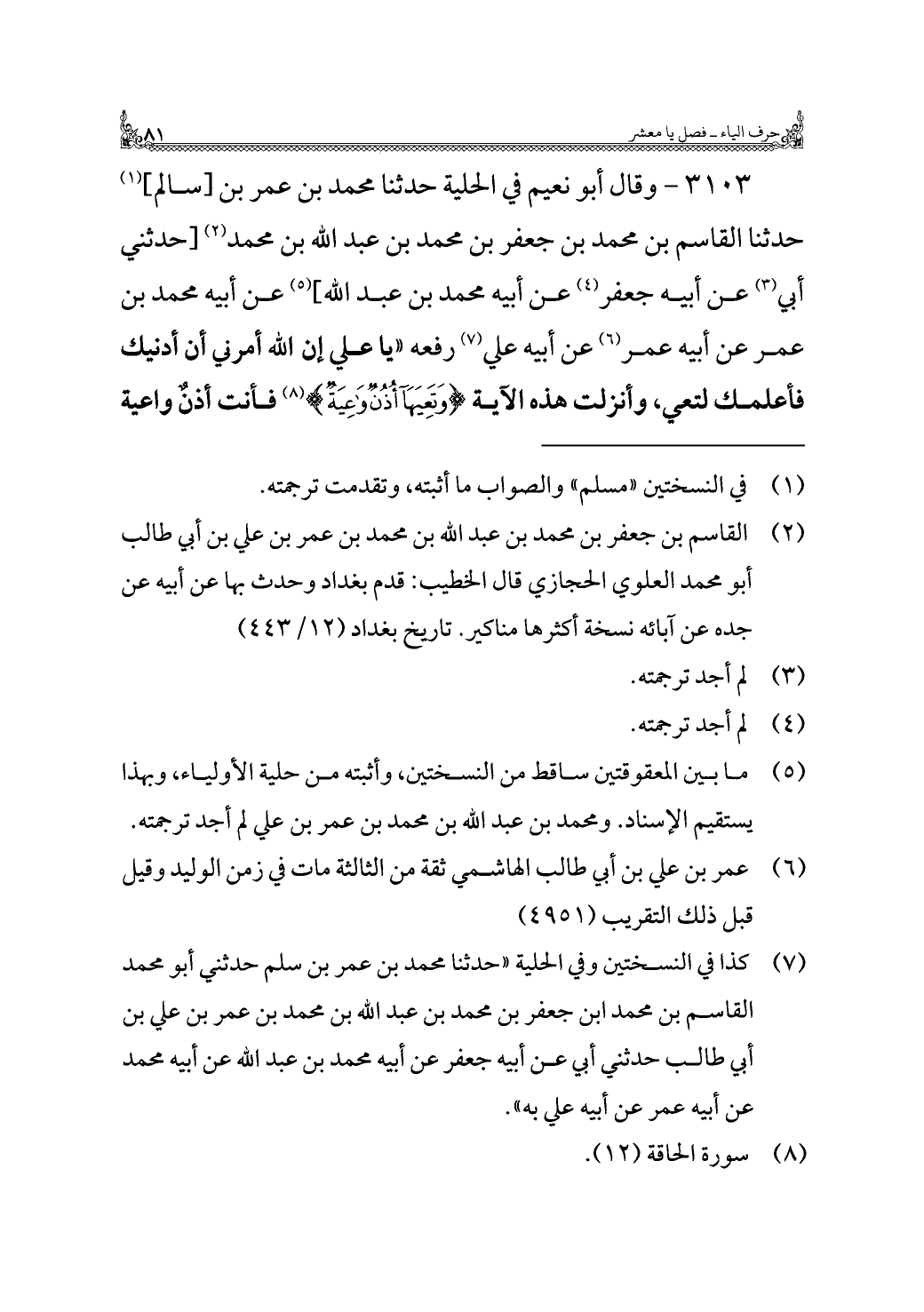 (¬٧) كذا في النسختين وفي الحلية "حدثنا محمد بن عمر بن سلم حدثني أبو محمد القاسم بن محمد بن جعفر بن محمد بن عبد الله بن محمد بن عمر بن علي بن أبي طالب حدثني أبي عن أبيه جعفر عن أبيه محمد بن عبد الله عن أبيه محمد عن أبيه عمر عن أبيه علي به".