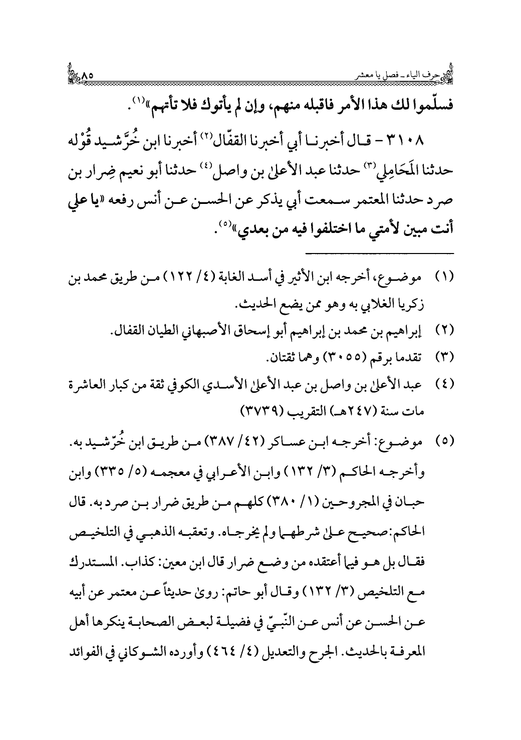 ٣١٠٨ - قال أخبرنا أبي أخبرنا القفّال (¬٢) أخبرنا ابن خُرَّشيد قوْله حدثنا المَحَامِلي (¬٣) حدثنا عبد الأعلى بن واصل (¬٤) حدثنا أبو نعيم ضِرار بن صرد حدثنا المعتمر سمعت أبي يذكر عن الحسن عن أنس رفعه "يا علي أنت مبين لأمتي ما اختلفوا فيه من بعدي" (¬٥).