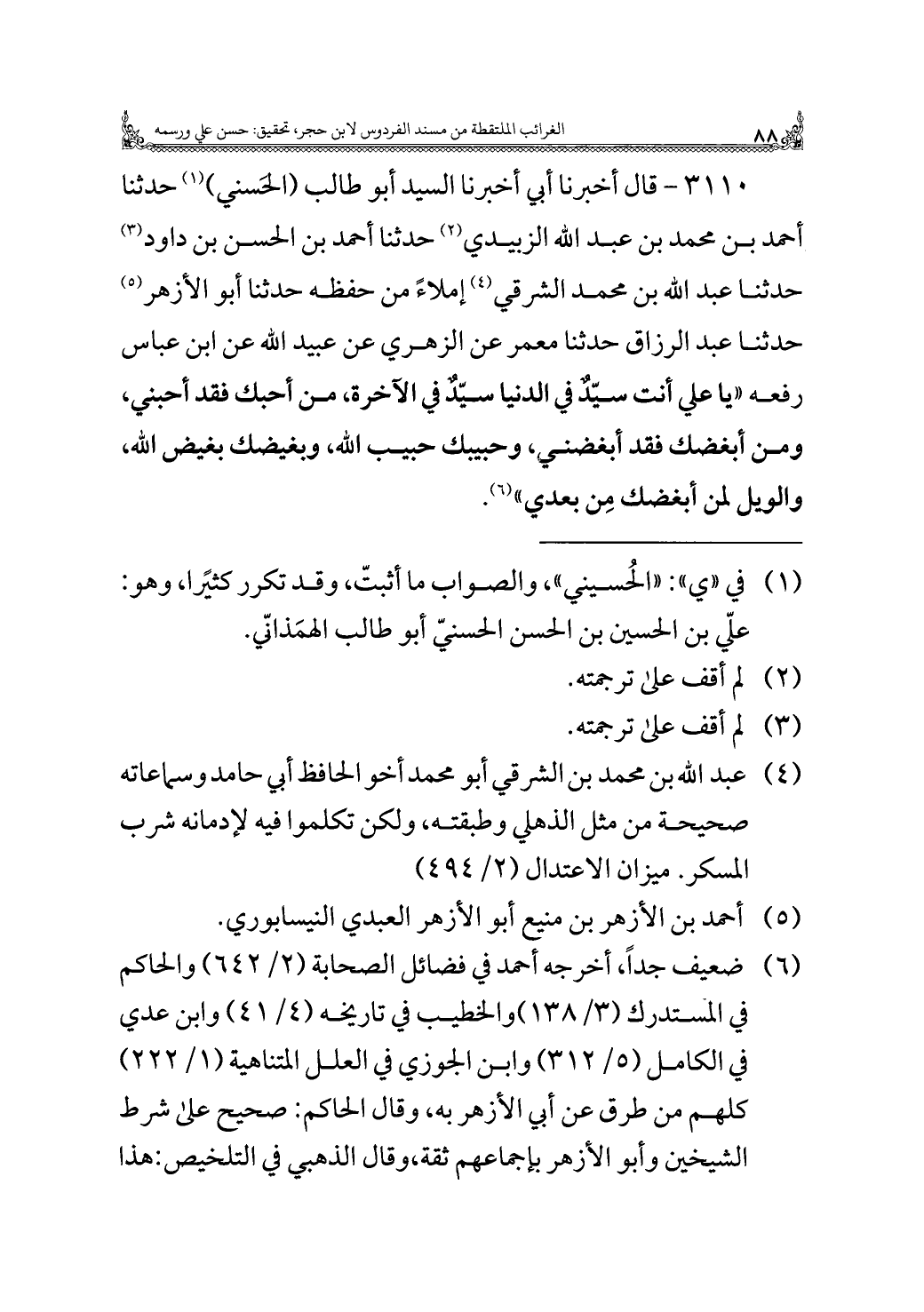 ٣١١٠ - قال أخبرنا أبي أخبرنا السيد أبو طالب (الحَسني) (¬١) حدثنا أحمد بن محمد بن عبد الله الزبيدي (¬٢) حدثنا أحمد بن الحسن بن داود (¬٣) حدثنا عبد الله بن محمد الشرقي (¬٤) إملاءً من حفظه حدثنا أبو الأزهر (¬٥) حدثنا عبد الرزاق حدثنا معمر عن الزهري عن عبيد الله عن ابن عباس رفعه "يا علي أنت سيّدٌ في الدنيا سيّدٌ في الآخرة، من أحبك فقد أحبني، ومن أبغضك فقد أبغضني، وحبيبك حبيب الله، وبغيضك بغيض الله، والويل لمن أبغضك مِن بعدي" (¬٦).