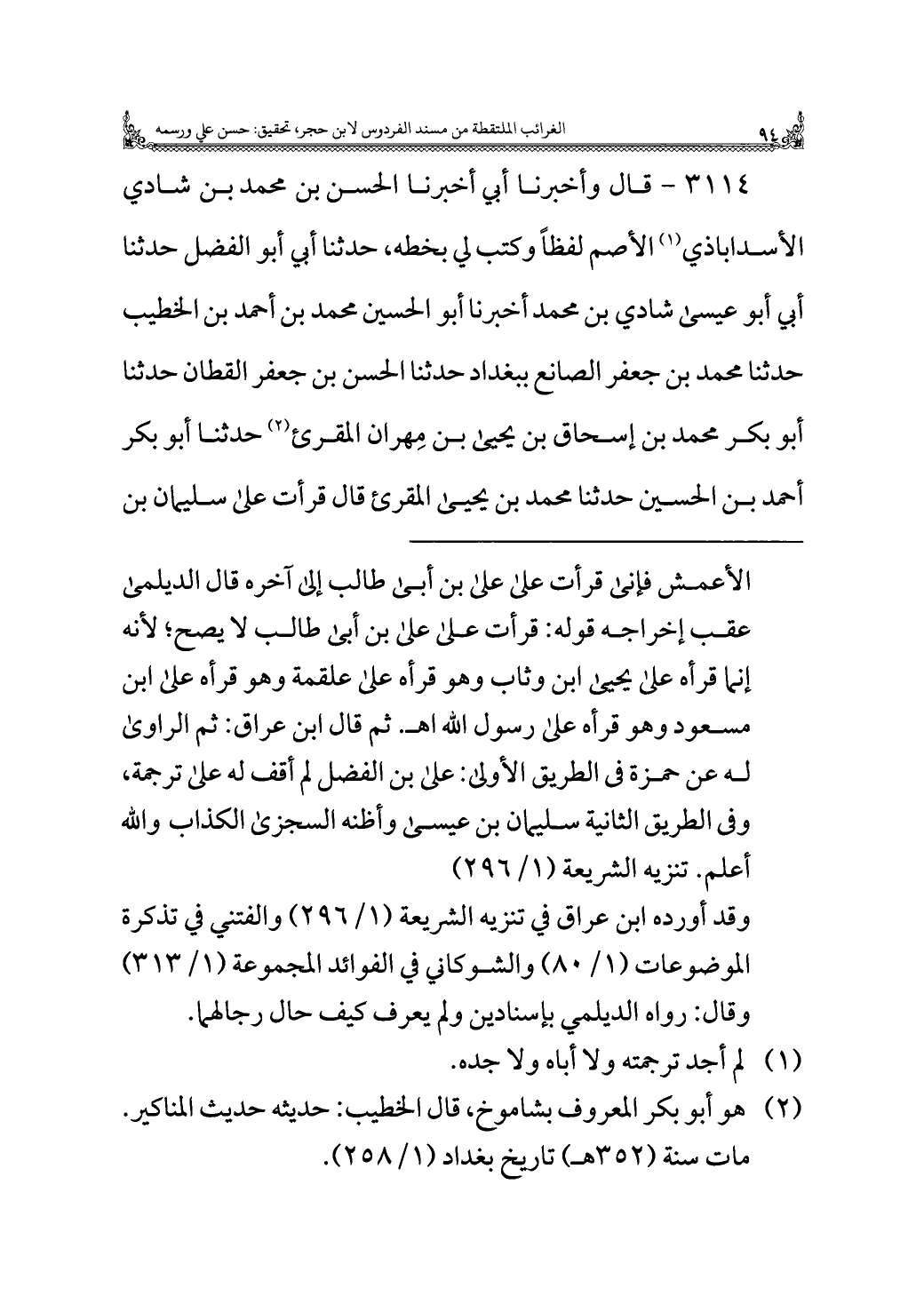 = الأعمش فإني قرأت على علي بن أبي طالب إلى آخره قال الديلمي عقب إخراجه قوله: قرأت على علي بن أبي طالب لا يصح؛ لأنه إنما قرأه على يحيى بن وثاب وهو قرأه على علقمة وهو قرأه على ابن مسعود وهو قرأه على رسول الله اهـ. ثم قال ابن عراق: ثم الراوى له عن حمزة في الطريق الأولى: على بن الفضل لم أقف له على ترجمة، وفى الطريق الثانية سليمان بن عيسى وأظنه السجزى الكذاب والله أعلم. تنزيه الشريعة (١/ ٢٩٦).