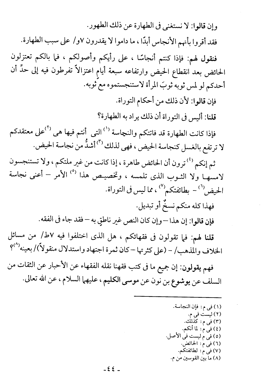 فهم يقولون: إن جميع ما في كتب فقهنا نقله الفقهاء عن الأحبار عن الثقات من السلف عن يوشع بن نون عن موسى الكليم، عليهما السلام، عن الله تعالى.