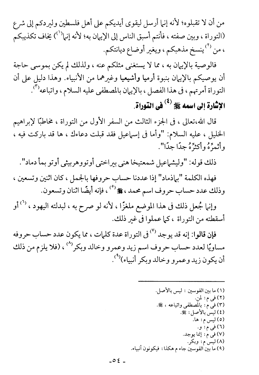 فإن قالوا: إنه قد يوجد في التوراة عدة كلمات، مما يكون عدد حساب حروفه مساويًا لعدد حساب حروف اسم زيد وعمرو وخالد وبكر، فلا يلزم من ذلك أن يكون زيد وعمرو وخالد وبكر أنبياء.