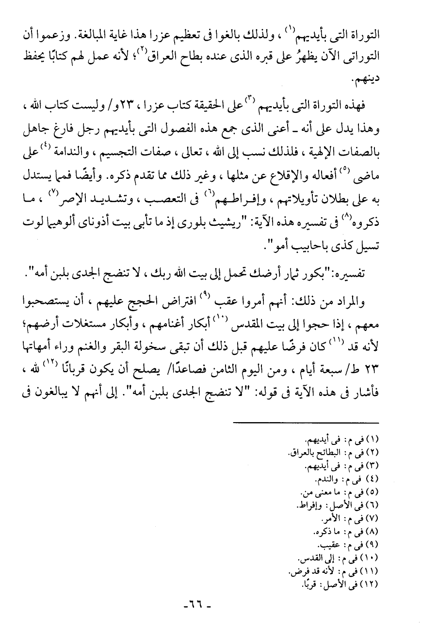وهذا يدل على أنه - أعني الذي جمع هذه الفصول التي بأيديهم رجل فارغ جاهل بالصفات الإلهية، فلذلك نسب إلى الله، تعالى، صفات التجسيم، والندامة على ماضى أفعاله والإقلاع عن مثلها، وغير ذلك مما تقدم ذكره. وأيضًا فمما يستدل به على بطلان تأويلاتهم، وإفراطهم في التعصب، وتشديد الإصر، ما ذكروه في تفسيره هذه الآية:
