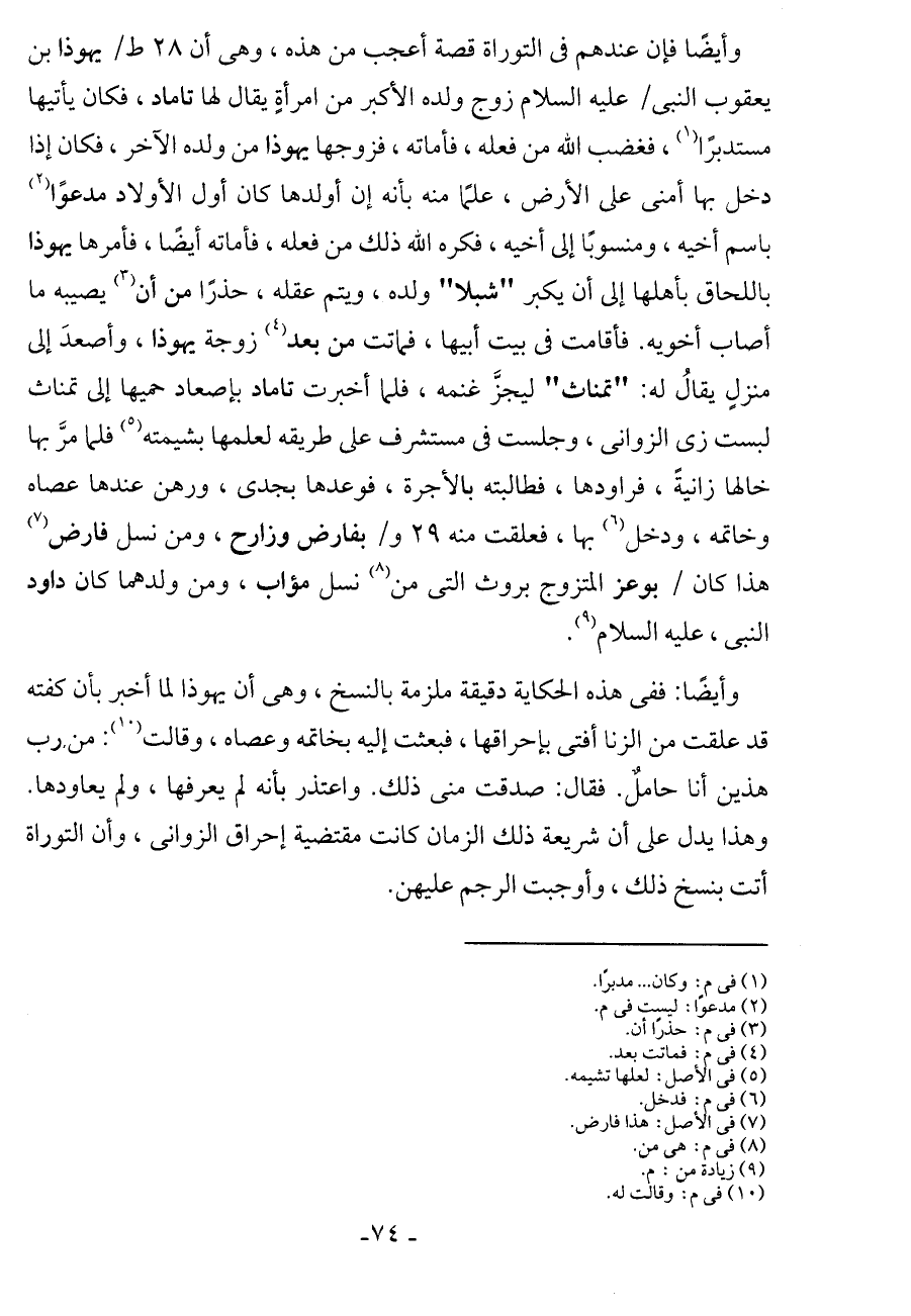 وأيضًا: ففى هذه الحكاية دقيقة ملزمة بالنسخ، وهى أن يهوذا لما أخبر بأن كفته قد علقت من الزنا أفتى بإحراقها، فبعثت إليه بخاتمه وعصاه، وقالت: من، رب هذين أنا حامل. فقال: صدقت منى ذلك. واعتذر بأنه لم يعرفها، ولم يعاودها.