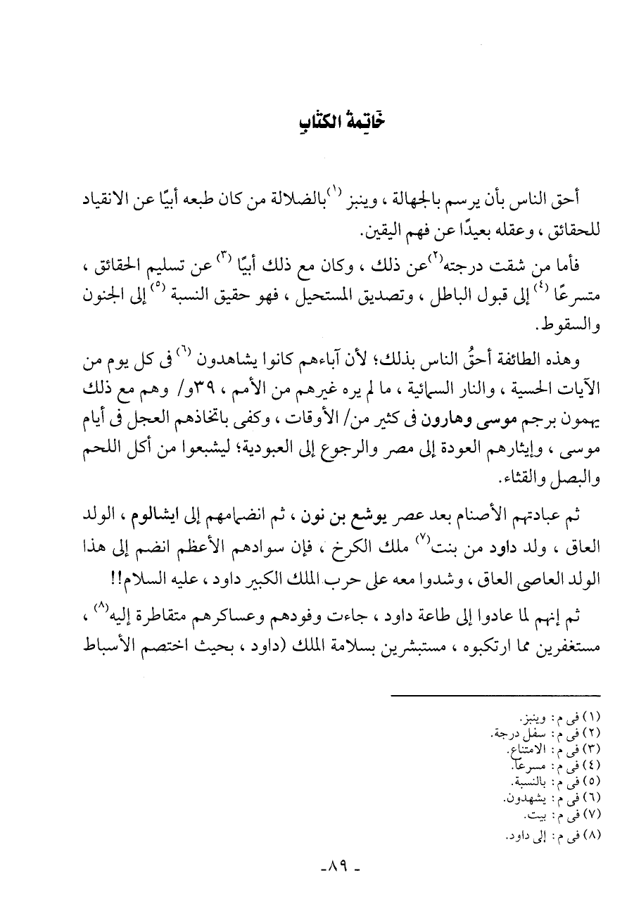 ثم عبادتهم الأصنام بعد عصر يوشع بن نون، ثم انضمامهم إلى ايشالوم، الولد العاق، ولد داود من بنت ملك الكرخ، فإن سوادهم الأعظم انضم إلى هذا الولد العاصي العاق، وشدوا معه على حرب الملك الكبير داود، عليه السلام!!