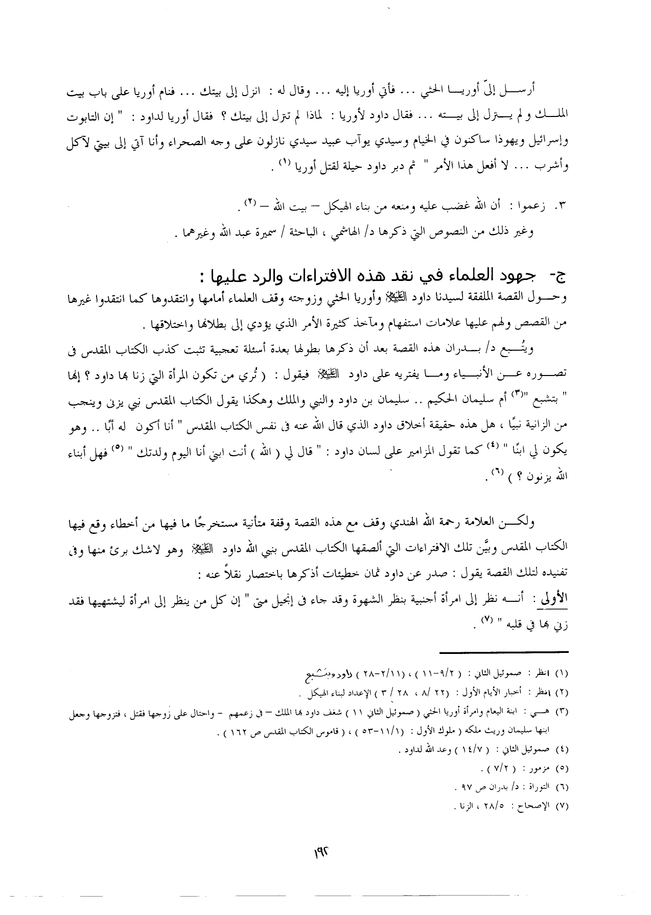 ولكن العلامة رحمة الله الهندي وقف مع هذه القصة وقفة متأنية مستخرجًا ما فيها من أخطاء وقع فيها الكتاب المقدس وبيَّن تلك الافتراءات التي ألصقها الكتاب المقدس بنبي الله داود - عليه السلام - وهو لا شك برئ منها وفى تفنيده لتلك القصة يقول: صدر عن داود ثمان خطيئات أذكرها باختصار نقلًا عنه: