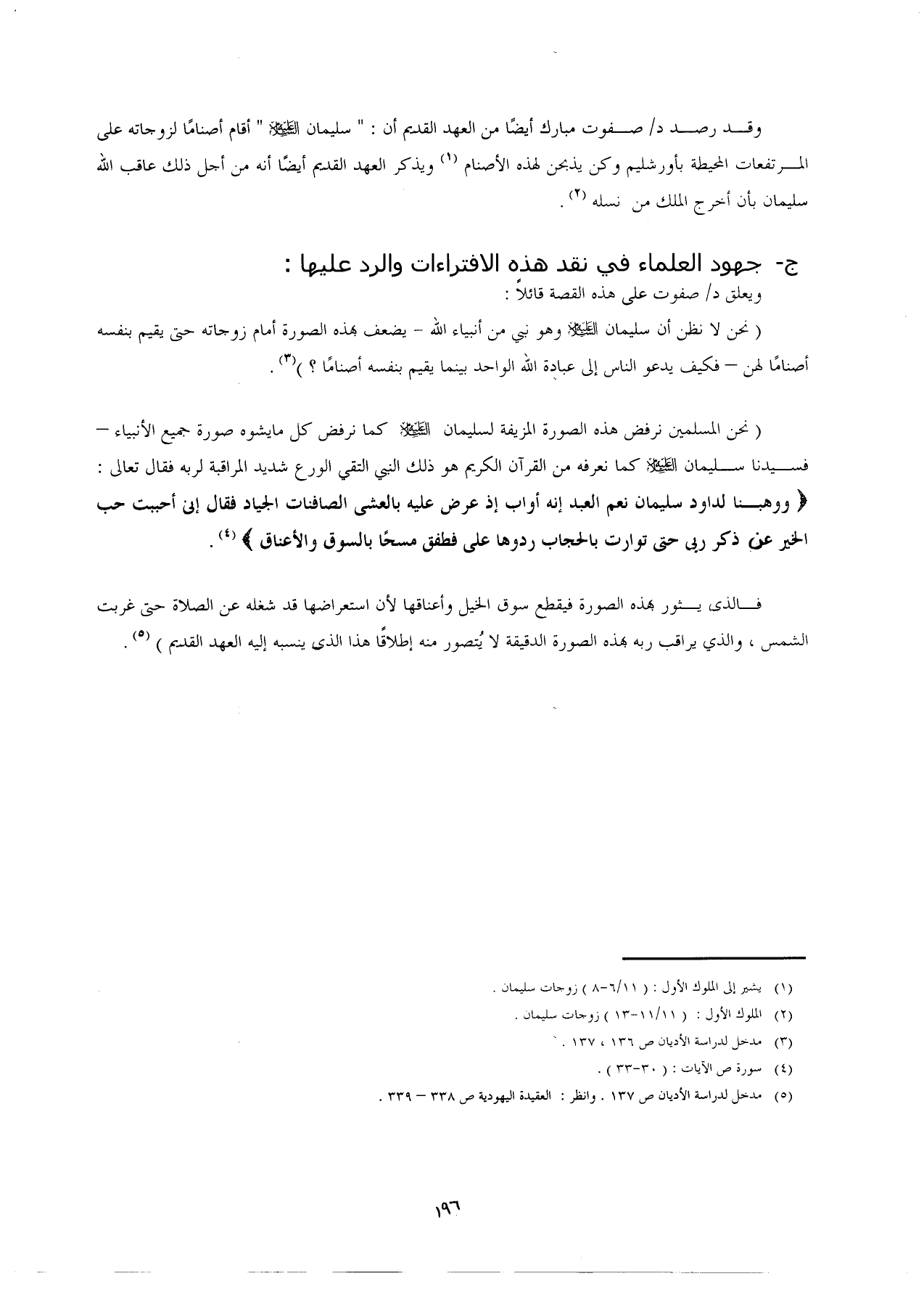 (نحن لا نظن أن سليمان - عليه السلام - وهو نبي من أنبياء الله - يضعف بهذه الصورة أمام زوجاته حتى يقيم بنفسه أصنامًا لهن - فكيف يدعو الناس إلى عبادة الله الواحد بينما يقيم بنفسه أصنامًا؟) (¬3).