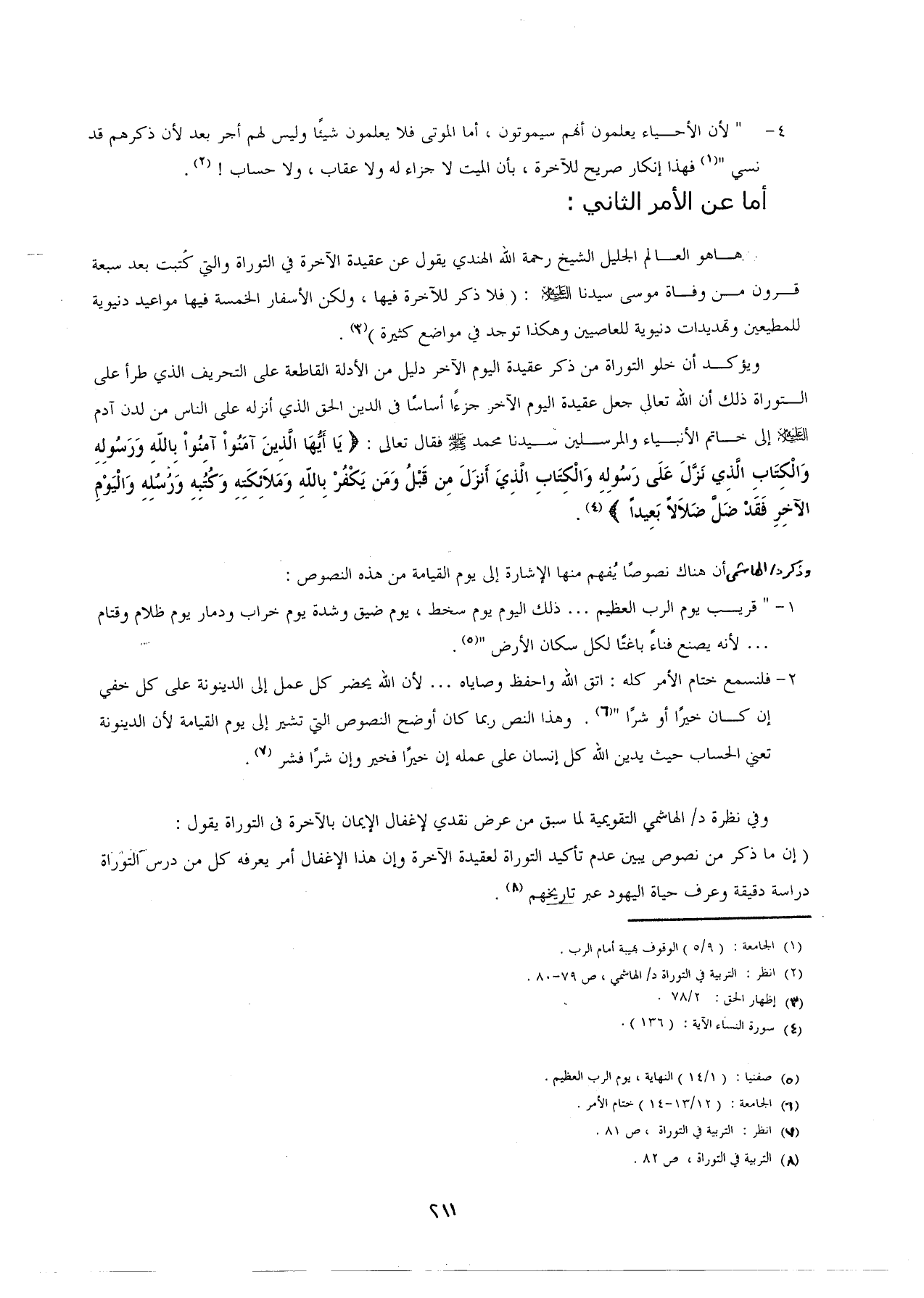 ويؤكد أن خلو التوراة من ذكر عقيدة اليوم الآخر دليل من الأدلة القاطعة على التحريف الذي طرأ على التوراة ذلك أن الله تعالى جعل عقيدة اليوم الآخر جزءًا أساسًا في الدين الحق الذي أنزله على الناس من لدن آدم - عليه السلام - إلى خاتم الأنبياء والمرسلين سيدنا محمد - صلى الله عليه وسلم - فقال تعالى: {يَا أَيُّهَا الَّذِينَ آمَنُوا آمِنُوا بِاللَّهِ وَرَسُولِهِ وَالْكِتَابِ الَّذِي نَزَّلَ عَلَى رَسُولِهِ وَالْكِتَابِ الَّذِي أَنْزَلَ مِنْ قَبْلُ وَمَنْ يَكْفُرْ بِاللَّهِ وَمَلَائِكَتِهِ وَكُتُبِهِ وَرُسُلِهِ وَالْيَوْمِ الْآخِرِ فَقَدْ ضَلَّ ضَلَالًا بَعِيدًا} (¬4).