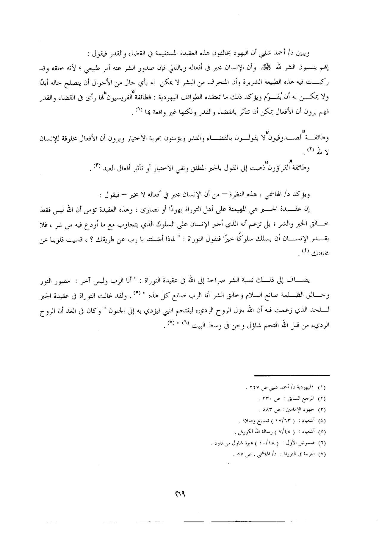 إنهم ينسبون الشر لله -عَزَّ وَجَلَّ- وأن الإنسان مجبر في أفعاله وبالتالي فإن صدور الشر عنه أمر طبيعي؛ لأنه خلقه وقد ركبت فيه هذه الطبيعة الشريرة وأن المنحرف من البشر لا يمكن له بأي حال من الأحوال أن ينصلح حاله أبدًا ولا يمكن له أن يُقوّم ويؤكد ذلك ما تعتقده الطوائف اليهودية: فطائفة "الفريسيون" لها رأى في القضاء والقدر فهم يرون أن الأفعال يمكن أن تتأثر بالقضاء والقدر ولكنها غير واقعة بها (¬1).