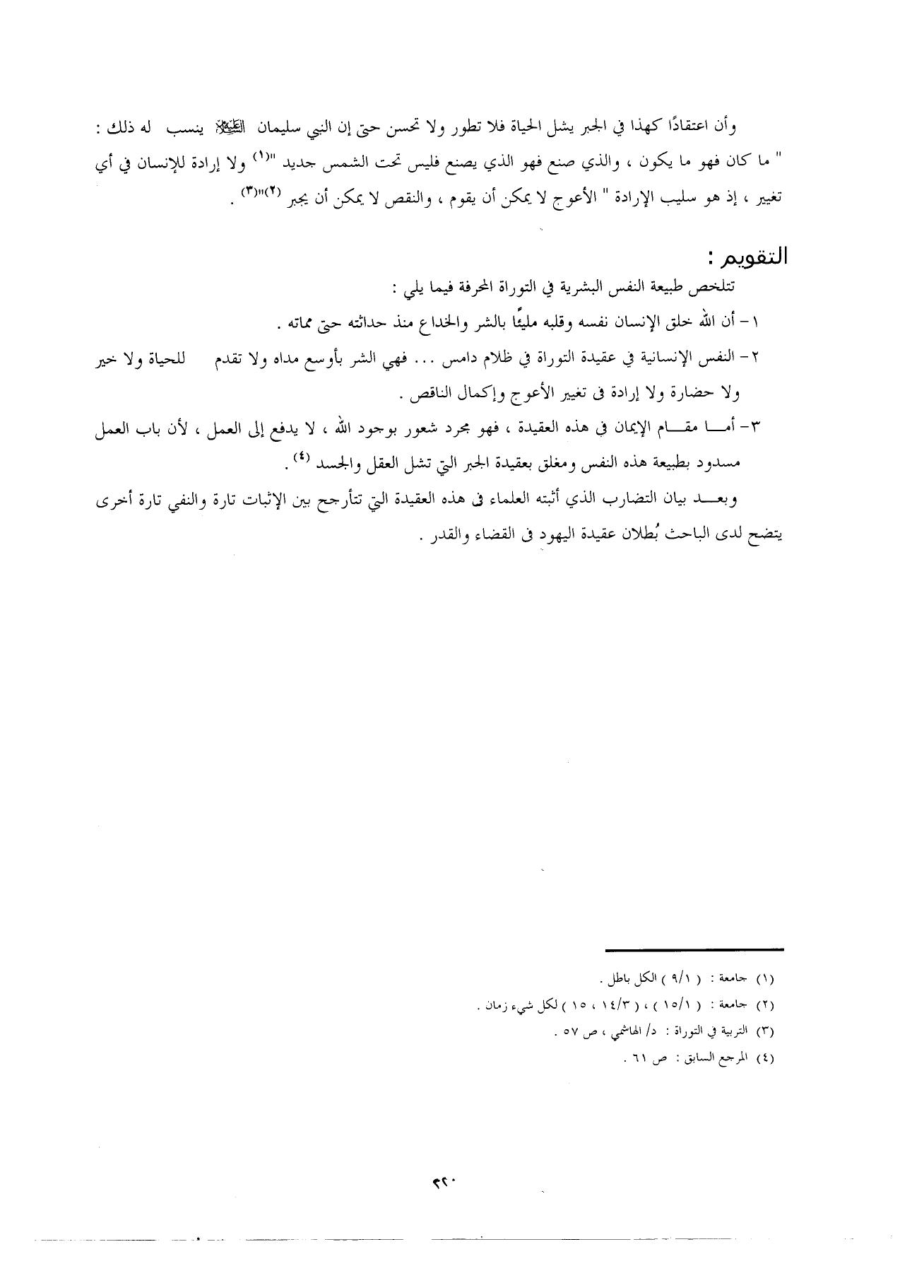 وأن اعتقادًا كهذا في الجبر يشل الحياة فلا تطور ولا تحسن حتى إن النبي سليمان - عليه السلام - ينسب له ذلك: "ما كان فهو ما يكون، والذي صنع فهو الذي يصنع فليس تحت الشمس جديد" (¬1) ولا إرادة للإنسان في أي تغيير، إذ هو سليب الإرادة "الأعوج لا يمكن أن يقوم، والنقص لا يمكن أن يجبر (¬2) " (¬3).
