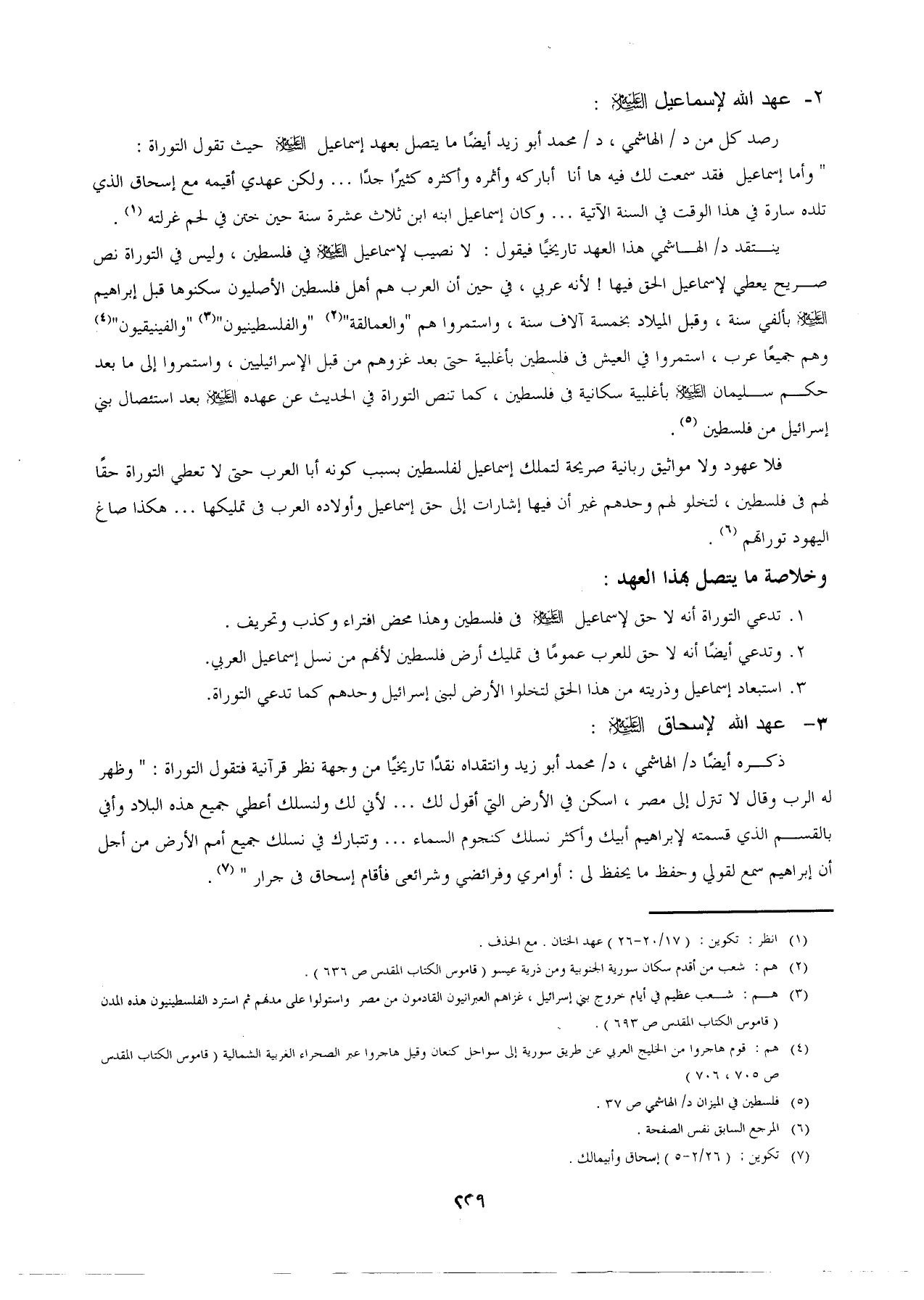ينتقد د/ الهاشمي هذا العهد تاريخيًا فيقول: لا نصيب لإسماعيل - عليه السلام - في فلسطين، وليس في التوراة نص صريح يعطى لإسماعيل الحق فيها! لأنه عربي، في حين أن العرب هم أهل فلسطين الأصليون سكنوها قبل إبراهيم - عليه السلام - بألفي سنة، وقبل الميلاد بخمسة آلاف سنة، واستمروا هم "والعمالقة" (¬2) "والفلسطينيون" (¬3) "والفينيقيون" (¬4) وهم جميعًا عرب، استمروا في العيش في فلسطين بأغلبية حتى بعد غزوهم من قبل الإسرائيليين، واستمروا إلى ما بعد حكم سليمان - عليه السلام - بأغلبية سكانية في فلسطين، كما تنص التوراة في الحديث عن عهده - عليه السلام - بعد استئصال بني إسرائيل من فلسطين (¬5).
