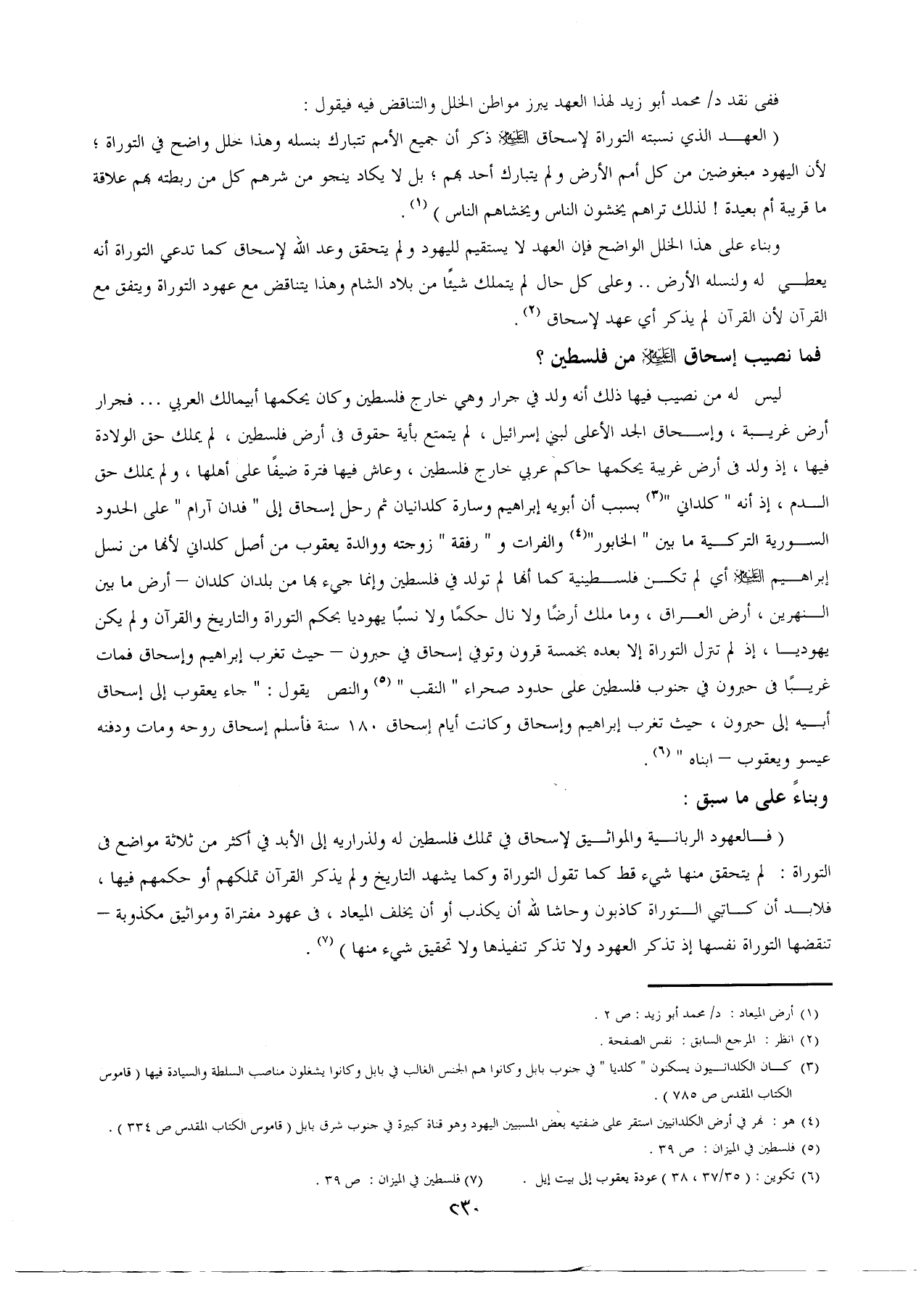 (فالعهود الربانية والمواثيق لإسحاق في تملك فلسطين له ولذراريه إلى الأبد في أكثر من ثلاثة مواضع في التوراة: لم يتحقق منها شيء قط كما تقول التوراة وكما يشهد التاريخ ولم يذكر القرآن تملكهم أو حكمهم فيها، فلابد أن كاتبي التوراة كاذبون وحاشا لله أن يكذب أو أن يخلف الميعاد، في عهود مفتراة ومواثيق مكذوبة - تنقضها التوراة نفسها إذ تذكر العهود ولا تذكر تنفيذها ولا تحقيق شىء منها) (¬7).