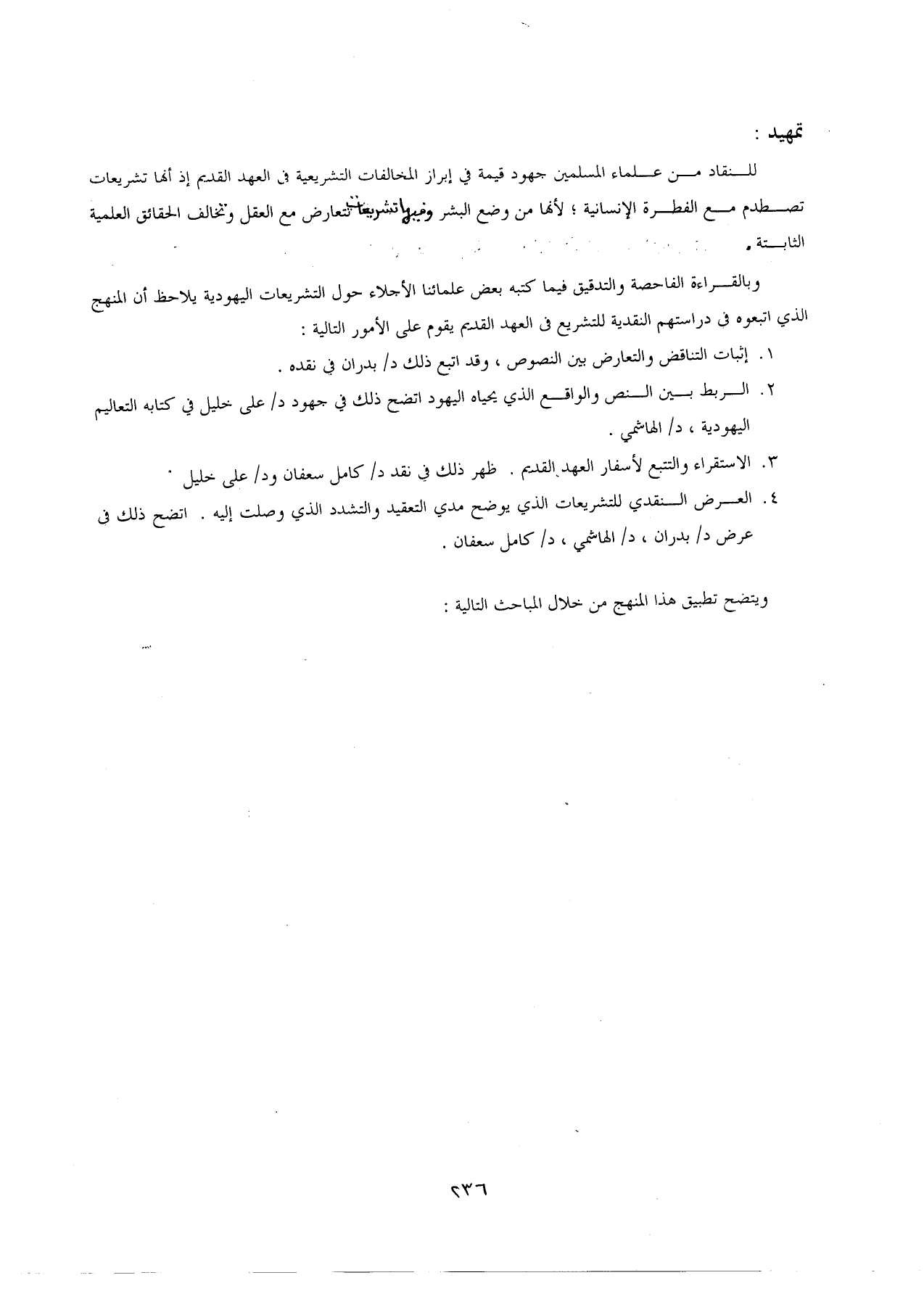 وبالقراءة الفاحصة والتدقيق فيما كتبه بعض علمائنا الأجلاء حول التشريعات اليهودية يلاحظ أن المنهج الذي اتبعوه في دراستهم النقدية للتشريع في العهد القديم يقوم على الأمور التالية: