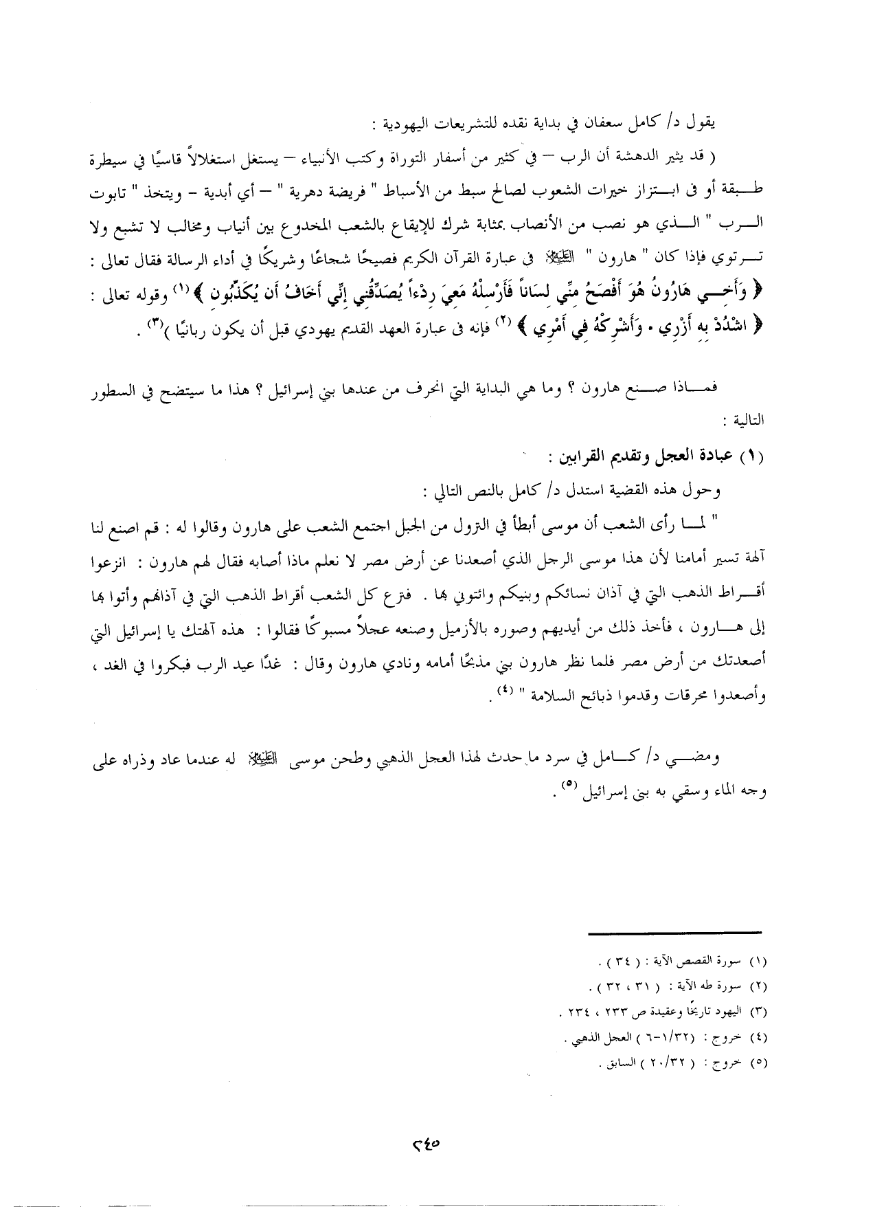 ومضي د/ كامل في سرد ما حدث لهذا العجل الذهبي وطحن موسى - عليه السلام - له عندما عاد وذراه على وجه الماء وسقى به بنى إسرائيل (¬5).