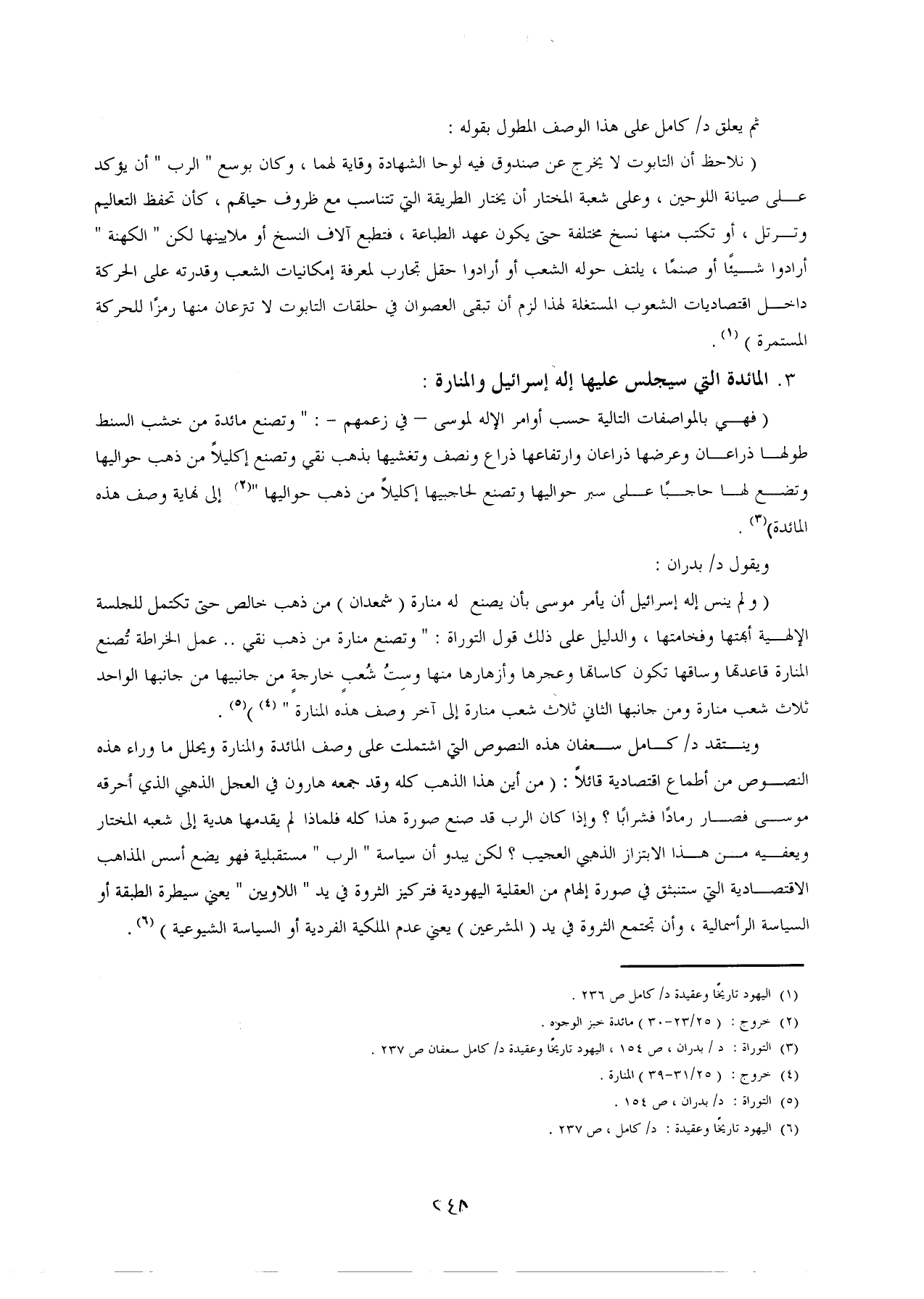 وينتقد د/ كامل سعفان هذه النصوص التى اشتملت على وصف المائدة والمنارة ويحلل ما وراء هذه النصوص من أطماع اقتصادية قائلًا: (من أين هذا الذهب كله وقد جمعه هارون في العجل الذهبي الذي أحرقه موسى فصار رمادًا فشرابًا؟ وإذا كان الرب قد صنع صورة هذا كله فلماذا لم يقدمها هدية إلى شعبه المختار ويعفيه من هذا الابتزاز الذهبي العجيب؟ لكن يبدو أن سياسة "الرب" مستقبلية فهو يضع أسس المذاهب الاقتصادية التي ستنبثق في صورة إلهام من العقلية اليهودية فتركيز الثروة في يد "اللاويين" يعني سيطرة الطبقة أو السياسة الرأسمالية، وأن تجتمع الثروة في يد (المشرعين) يعني عدم الملكية الفردية أو السياسة الشيوعية) (¬6).