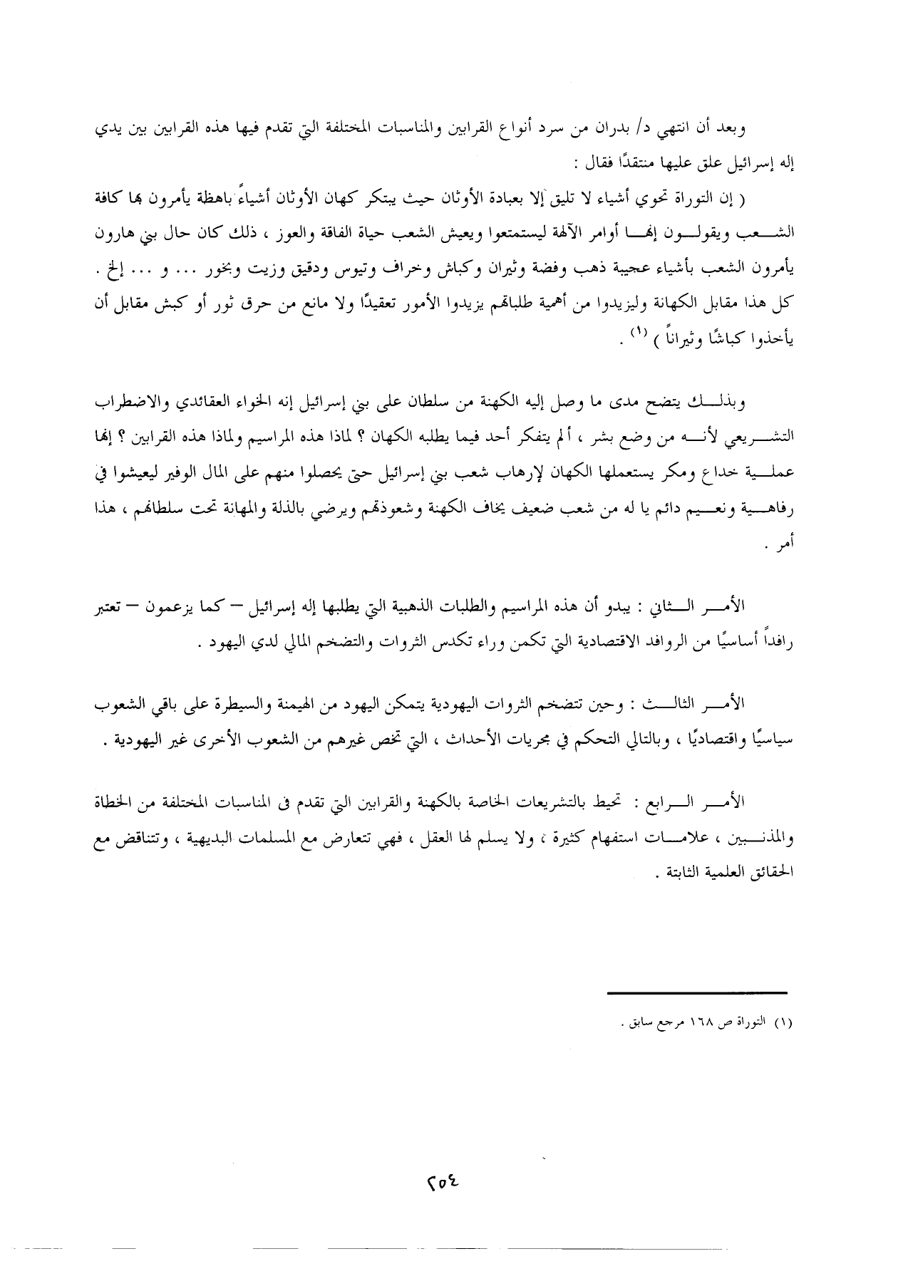 (إن التوراة تحوي أشياء لا تليق إلا بعبادة الأوثان حيث يبتكر كهان الأوثان أشياءً باهظة يأمرون بها كافة الشعب ويقولون إنها أوامر الآلهة ليستمتعوا ويعيش الشعب حياة الفاقة والعوز، ذلك كان حال بني هارون يأمرون الشعب بأشياء عجيبة ذهب وفضة وثيران وكباش وخراف وتيوس ودقيق وزيت وبخور ... و ... إلخ كل هذا مقابل الكهانة وليزيدوا من أهمية طلباتهم يزيدوا الأمور تعقيدًا ولا مانع من حرق ثور أو كبش مقابل أن يأخذوا كباشًا وثيرانًا) (¬1).