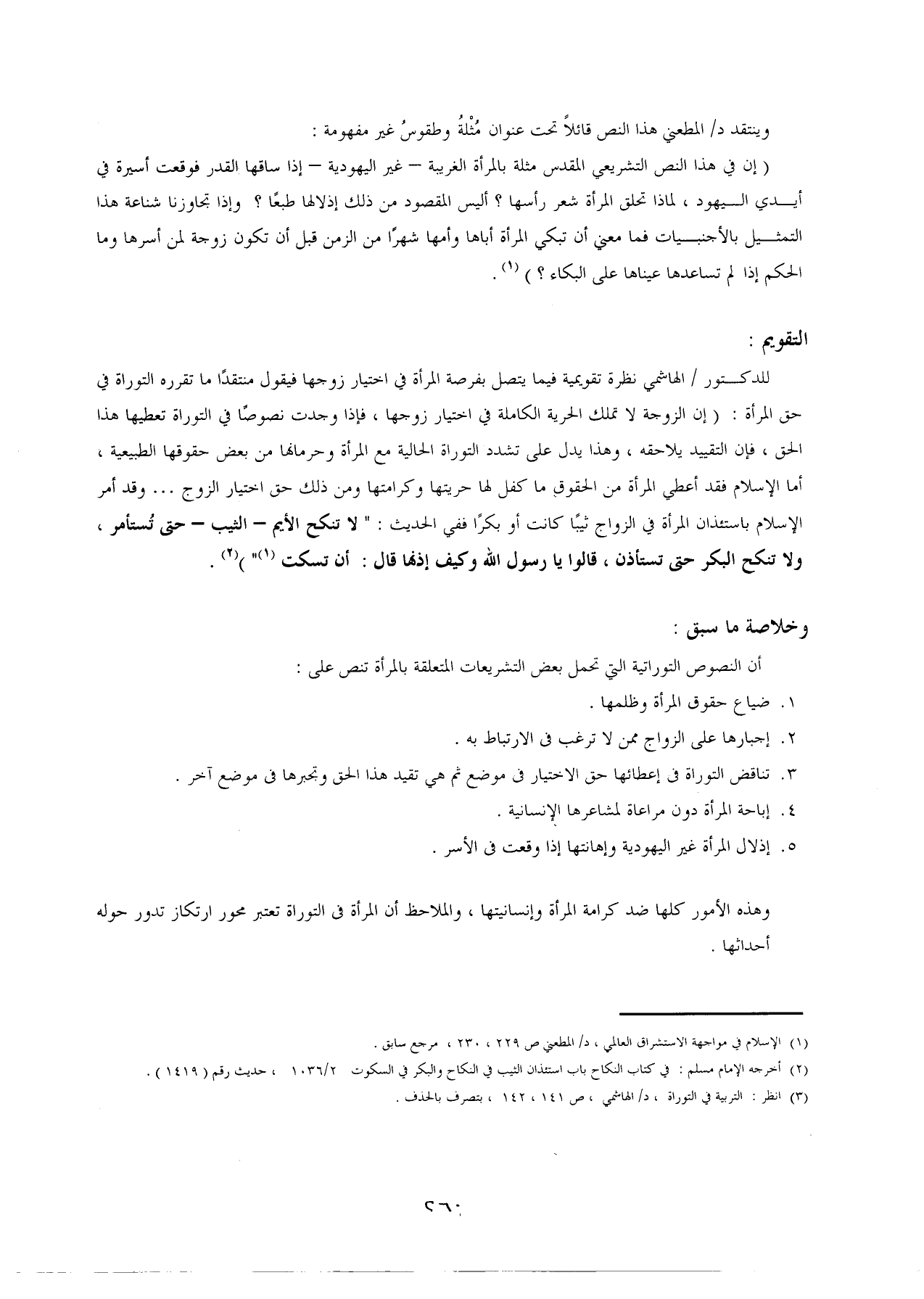 للدكتور / الهاشمى نظرة تقويمية فيما يتصل بفرصة المرأة في اختيار زوجها فيقول منتقدًا ما تقرره التوراة في حق المرأة: (إن الزوجة لا تملك الحرية الكاملة في اختيار زوجها، فإذا وجدت نصوصًا في التوراة تعطيها هذا الحق، فإن التقييد يلاحقه، وهذا يدلّ على تشدد التوراة الحالية مع المرأة وحرمانها من بعض حقوقها الطبيعية، أما الإِسلام فقد أعطي المرأة من الحقوق ما كفل لها حريتها وكرامتها ومن ذلك حق اختيار الزوج ... وقد أمر الإِسلام باستئذان المرأة في الزواج ثيبًا كانت أو بكرًا ففى الحديث: "لا تنكح الأيم- الثيّب- حتى تُستأمر، ولا تنكح البكر حتى تستأذن، قالوا يا رسول الله وكيف إذنها قال: أن تسكت (¬2) ") (¬3).