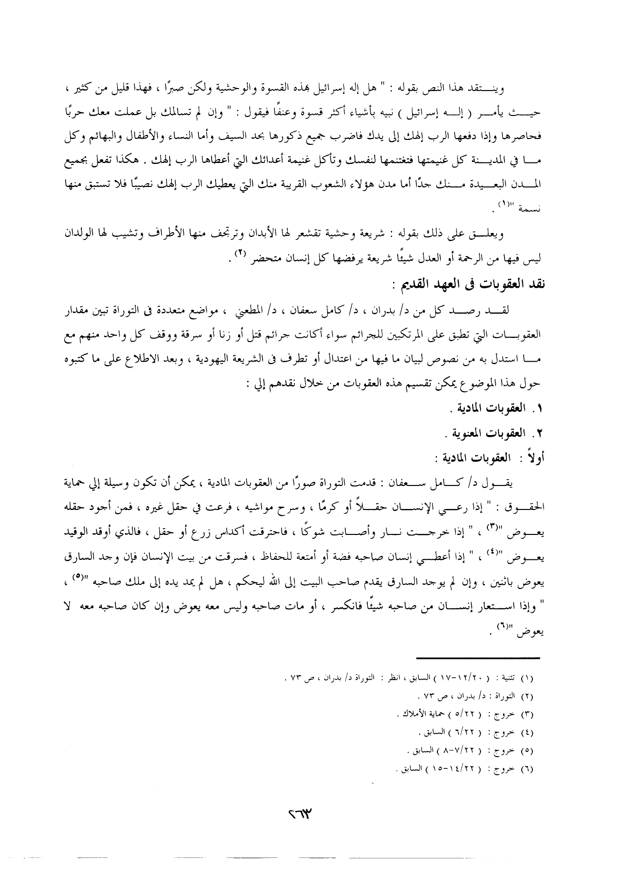 يقول د/ كامل سعفان: قدمت التوراة صورًا من العقوبات المادية، يمكن أن تكون وسيلة إلى حماية الحقوق: "إذا رعي الإنسان حقلًا أو كرمًا، وسرح مواشيه، فرعت في حقل غيره، فمن أجود حقله يعوض" (¬3)، "إذا خرجت نار وأصابت شوكًا، فاحترقت أكداس زرع أو حقل، فالذي أوقد الوقيد يعوص" (¬4)، إذا أعطي إنسان صاحبه فضة أو أمتعة للحفاظ، فسرقت من بيت الإنسان فإن وجد السارق يعوض باثنين، وإن لم يوجد السارق يقدم صاحب البيت إلى الله ليحكم، هل لم يمد يده إلى ملك صاحبه" (¬5)، "وإذا استعار إنسان من صاحبه شيئًا فانكسر، أو مات صاحبه وليس معه يعوض وإن كان صاحبه معه لا يعوض" (¬6).