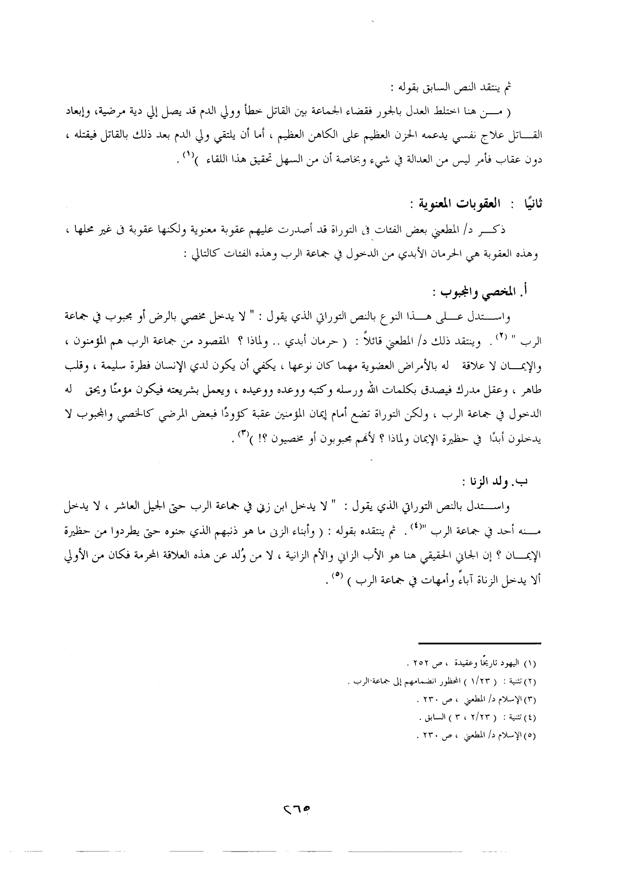 واستدل على هذا النوع بالنص التوراتي الذي يقول: "لا يدخل مخصي بالرض أو مجبوب في جماعة الرب" (¬2). وينتقد ذلك د/ المطعني قائلًا: (حرمان أبدي .. ولماذا؟ المقصود من جماعة الرب هم المؤمنون، والإيمان لا علاقة له بالأمراض العضوية مهما كان نوعها، يكفى أن يكون لدي الإنسان فطرة سليمة، وقلب طاهر، وعقل مدرك فيصدق بكلمات الله ورسله وكتبه ووعده ووعيده، ويعمل بشريعته فيكون مؤمنًا ويحق له الدخول في جماعة الرب، ولكن التوراة تضع أمام إيمان المؤمنين عقبة كؤودًا فبعض المرضي كالخصي والمجبوب لا يدخلون أبدًا في حظيرة الإيمان ولماذا؟ لأنهم مجبوبون أو مخصيون؟!) (¬3).