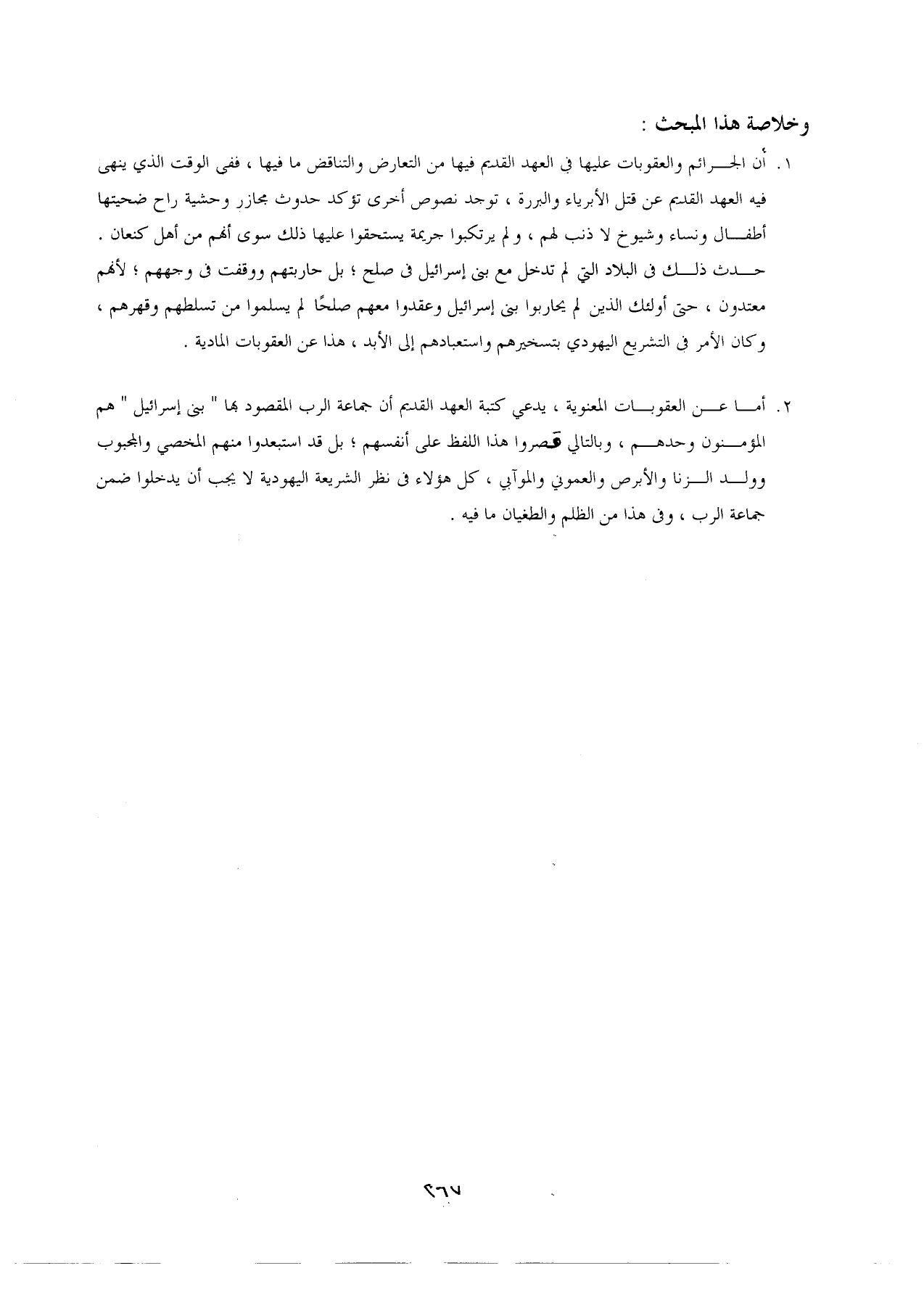 1 - أن الجرائم والعقوبات عليها في العهد القديم فيها من التعارض والتناقض ما فيها، ففى الوقت الذي ينهى فيه العهد القديم عن قتل الأبرياء والبررة، توجد نصوص أخرى تؤكد حدوث مجازر وحشية راح ضحيتها أطفال ونساء وشيوخ لا ذنب لهم، ولم يرتكبوا جريمة يستحقوا عليها ذلك سوى أنهم من أهل كنعان. حدث ذلك في البلاد التى لم تدخل مع بني إسرائيل في صلح؛ بل حاربتهم ووقفت في وجههم؛ لأنهم معتدون، حتى أولئك الذين لم يحاربوا بني إسرائيل وعقدوا معهم صلحًا لم يسلموا من تسلطهم وقهرهم، وكان الأمر في التشريع اليهودي بتسخيرهم واستعبادهم إلى الأبد، هذا عن العقوبات المادية.