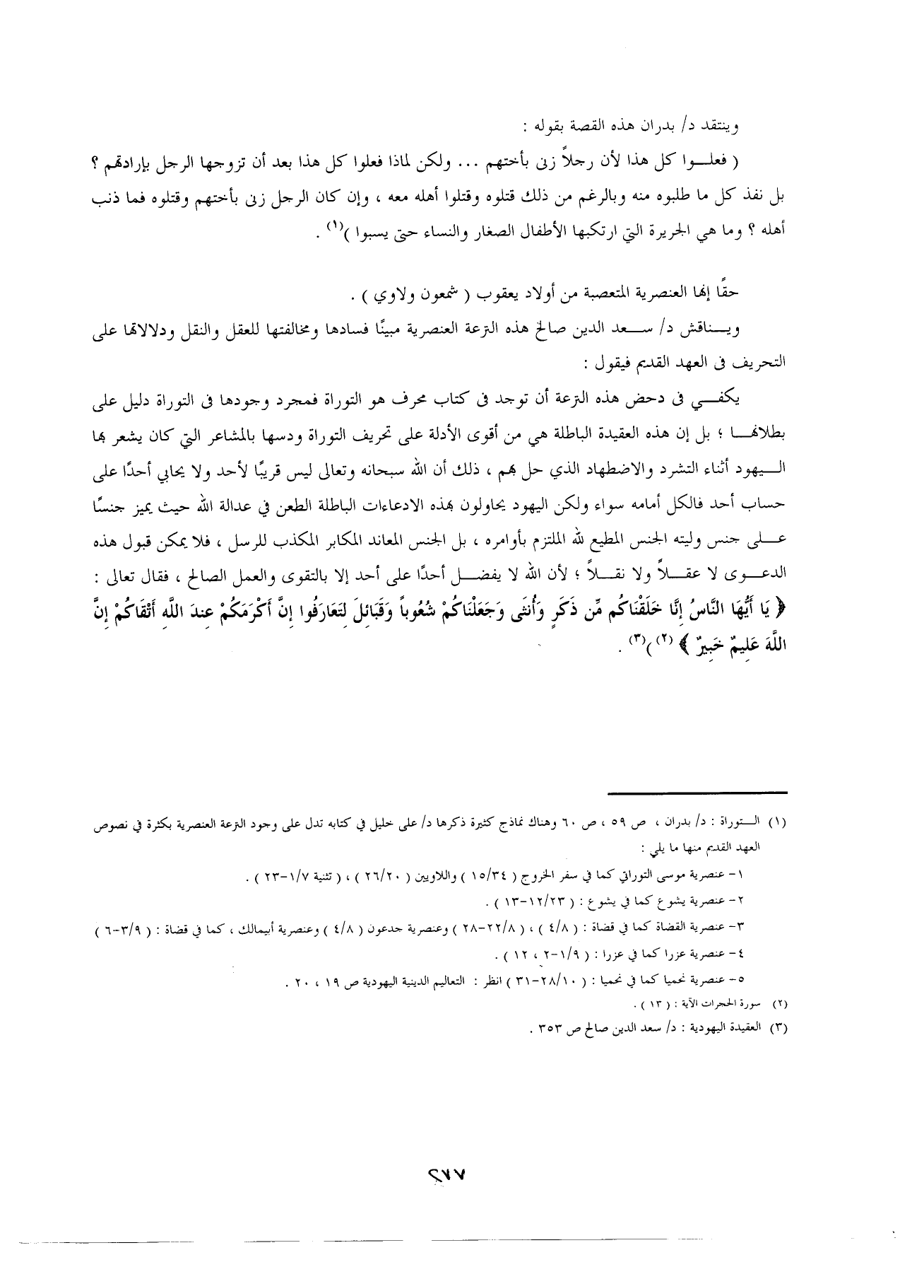 ويناقش د/ سعد الدين صالح هذه النزعة العنصرية مبينًا فسادها ومخالفتها للعقل والنقل ودلالاتها على التحريف في العهد القديم فيقول: