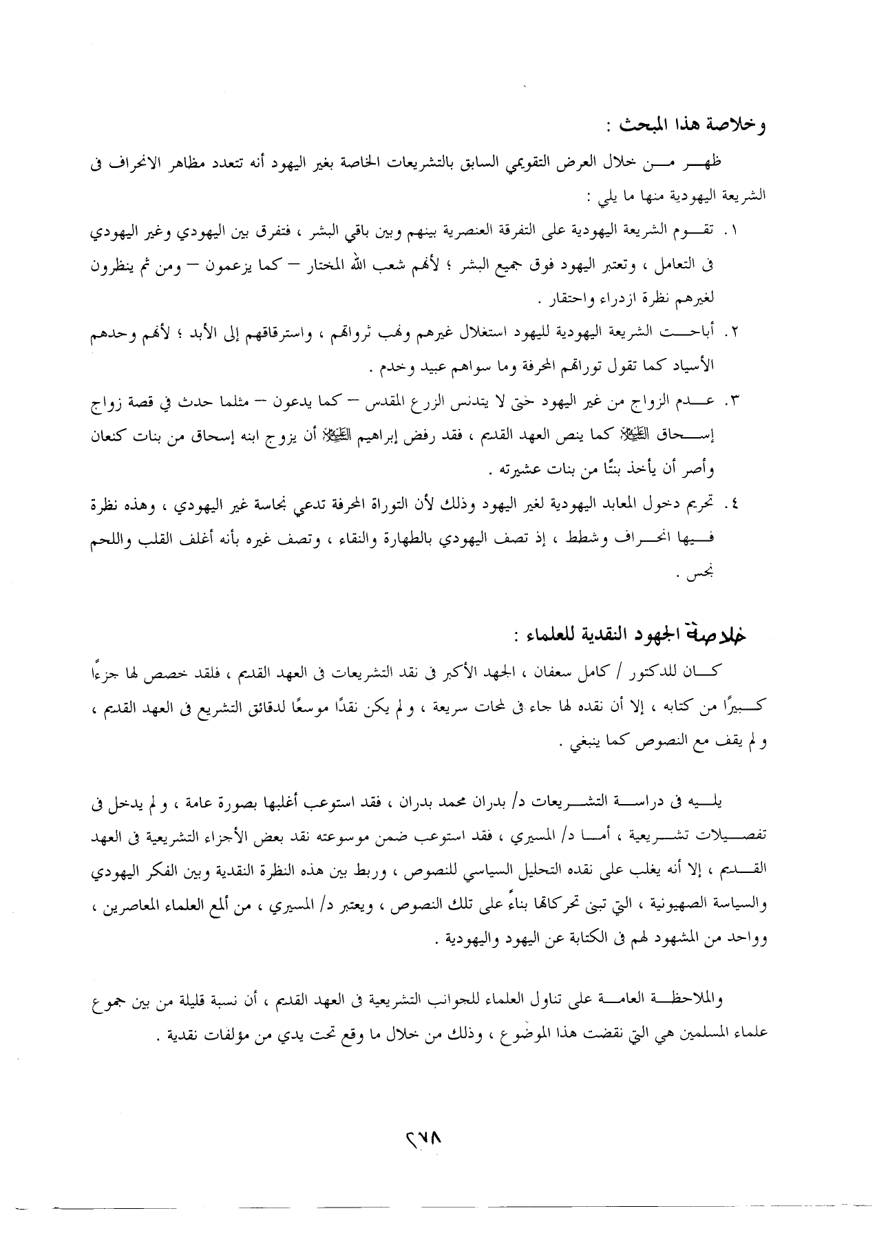 يليه في دراسة التشريعات د/ بدران محمَّد بدران، فقد استوعب أغلبها بصورة عامة، ولم يدخل في تفصيلات تشريعية، أما د/ المسيري، فقد استوعب ضمن موسوعته نقد بعض الأجزاء التشريعية في العهد القديم، إلا أنه يغلب على نقده التحليل السياسي للنصوص، وربط بين هذه النظرة النقدية وبين الفكر اليهودي والسياسة الصهيونية، التي تبني تحركاتها بناءً على تلك النصوص، ويعتبر د/ المسيري، من ألمع العلماء المعاصرين، وواحد من المشهود لهم في الكتابة عن اليهود واليهودية.