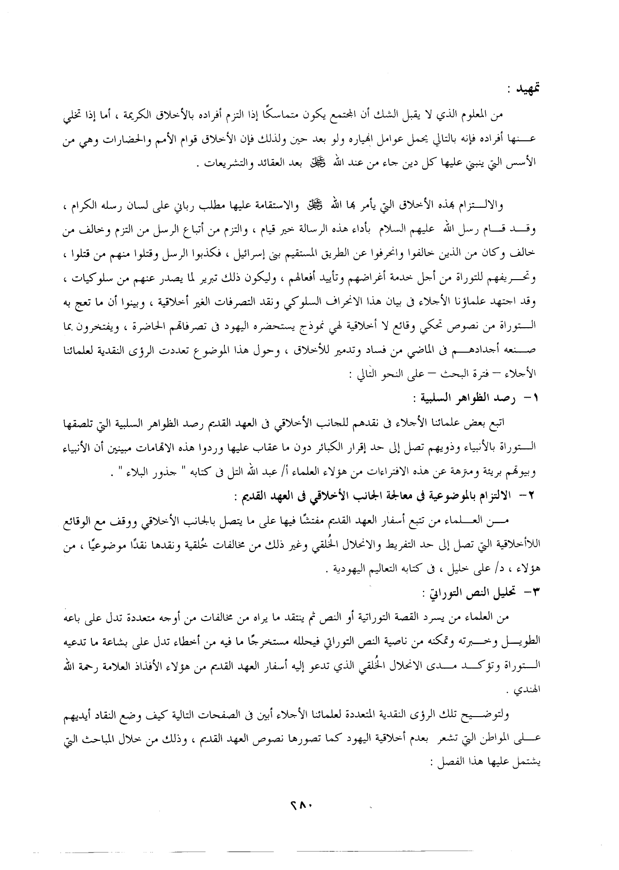 ولتوضيح تلك الرؤى النقدية المتعددة لعلمائنا الأجلاء أبين في الصفحات التالية كيف وضع النقاد أيديهم على المواطن التي تشعر بعدم أخلاقية اليهود كما تصورها نصوص العهد القديم، وذلك من خلال المباحث التي يشتمل عليها هذا الفصل: